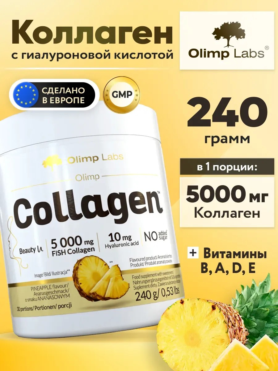 Олим Лабс, Олимп коллаген, 240 г, Ананас, Olimp Labs, Olimp Collagen 240 g, Pineapple – это пищевая добавка, содержащая гидролизованный рыбий коллаген, гиалуроновую кислоту и активные ингредиенты, выбранные с учетом их ценных свойств. Витамин С поддерживает синтез природного коллагена и является мощным антиоксидантом, защищающим кожу от свободных радикалов. Витамин А, витамин В2 и биотин, которые помогают поддерживать здоровое состояние кожи и волос. Селен помогает поддерживать состояние ногтей. Гиалуроновая hyaluronic кислота широко используется в увлажняющем уходе за сухой кожей благодаря своим водосвязывающим свойствам. Медь – помогает поддерживать правильную пигментацию кожи и состояние соединительных тканей. Поддерживает защиту клеток от окислительного стресса. Экстракт виноградных косточек, обладающий антиоксидантными свойствами, помогает нейтрализовать воздействие свободных радикалов. Препарат отлично подойдет группам людей, желающим выглядеть красивыми и здоровыми. Благодаря витаминам и минеральным веществам, данный vitamin complex поддерживает иммунитет, повышает энергию и помогает в снижении веса. Натуральный питьевой пептидный комплекс морского калагена и гиалурон кислоты способствует росту здоровых волос и ногтей. Этот колаген популярен среди спортсменов мужчин и спортсменок, так как помогает улучшить спорт физическую форму и обеспечивает необходимые питательные вещества для оптимальной работы мышц и сердца. Пептиды морского коллагена способствуют снижению веса и противодействуют проблемам с кожей, таким как прыщи и морщины, способствуют увлажнению и лифтинг эффекту. Collagen поддерживает здоровье сосудов и глаз, помогает укрепить иммунную систему и повысить память и концентрацию мозга. Peptides кологена эффективно борются с возрастными изменениями и способствуют молодости и красоте кожи лица. Комплексный препарат также является незаменимым для женщин и девушек, которые хотят сохранить свою женскую красоту и привлекательность. Уникальная формула мульти витаминного комплекса обеспечивает восстановление и поддержание здоровья организма, повышение энергии и силы. Благодаря профессиональному составу, биодобавка является эффективным помощником в борьбе с проблемами против выпадения волос и похудения. Продукт обладает противовоспалительными и противовирусными свойствами, способствует укреплению связок, хрящей и суставов, придавая ощущение легкости и бодрости. Высокоэффективное средство современного спортивного питания (спорт пит) подходит для использования как взрослыми людьми, занимающимися спортом, так и теми, кто хочет поддерживать баланс здоровья и красоту в повседневной жизни. ПРИМЕНЕНИE: Растворите 1 порцию порошка (8 г) в 250 мл воды или другого напитка с помощью шейкера. Употребляйте ежедневно после еды. ПРЕДУПРЕЖДЕНИЕ: Проконсультируйтесь с врачом перед применением пищевых добавок, если вы проходите курс лечения, а также в период беременности и лактации.