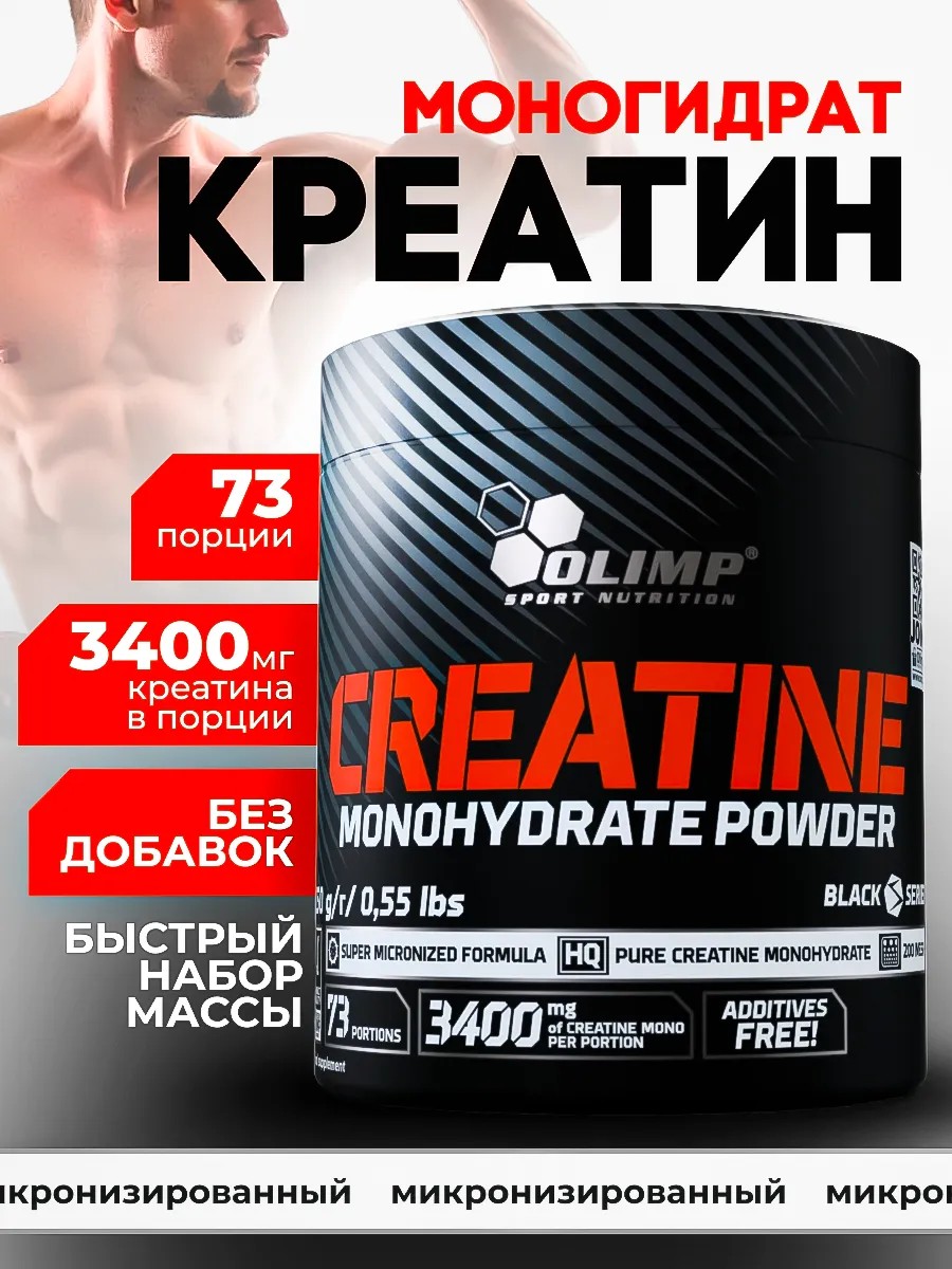73 порции - Креатин моногидрат микронизированный Olimp Sport Nutrition 250 г — энергия и сила для ваших тренировок. Olimp Sport Nutrition представляет высококачественный креатин моногидрат, который станет вашим надежным помощником в достижении спортивных целей. Каждая порция содержит 3400 мг чистого креатина, обеспечивая мощную поддержку для увеличения силы, выносливости и мышечной массы.