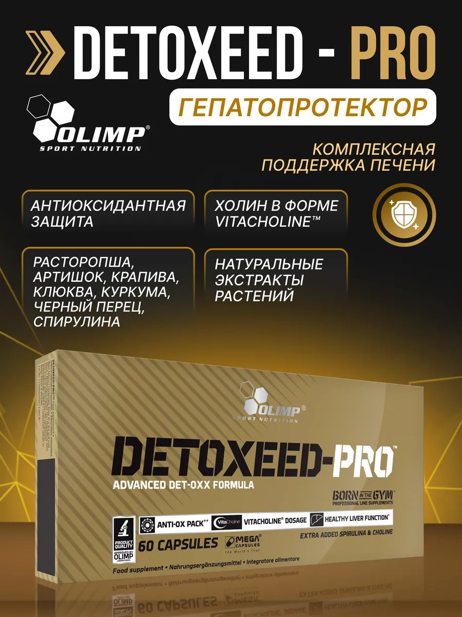 Detoxeed-Pro комплексный продукт поддерживающий защиту печени с антиоксидантными свойствами. Что делает Detoxeed-Pro особенным? Запатентованная форма VitaCholine, натуральные ингридиенты, стандартизированные экстракты растений, каждая партия ингредиентов сырья и каждый продукт проходят фармацевтические и лабораторные испытания. Ваша печень - второй по загруженности орган в вашем теле, необходима дополнительная поддержка, особенно при интенсивных физических нагрузках. Detoxeed-Pro - это пищевая добавка в форме капсул, содержащая усовершенствованную формулу растительных ингредиентов, состоящую из экстрактов расторопши, артишока, крапивы, крупной клюквы, корневища куркумы и черного перца, с добавлением холина и спирулины. Холин, экстракт расторопши и артишока помогают правильному функционированию печени. Спирулина - источник антиоксидантов. Экстракт черного перца способствует усвоению питательных веществ и повышает эффективность других растительных ингредиентов. Эта комплексная формула, обладающая антиоксидантными свойствами, поможет поддерживать полезное состояние печени. Detoxeed-Pro изготовлен исключительно из натуральных ингредиентов, только стандартизированных растительных экстрактов и нашей запатентованной формы VitaCholine. Все они проходят лабораторные испытания и созданы в фармацевтическом качестве.