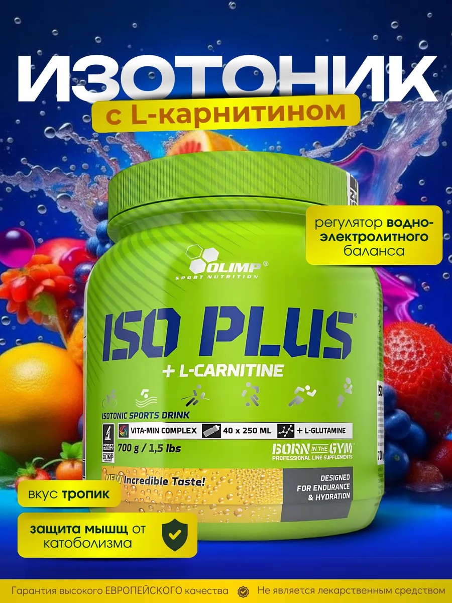 Спортивная добавка ISO Plus + L-Карнитин ( вкус Тропик ) от компании Olimp Sport Nutrition позволяет создать изотонический напиток с л-карнитином, минеральными веществами и витаминами. Имеет оптимальную концентрацию углеводов и электролитов в составе. Восполняет дефицит жидкости и минеральных веществ в организме при длительных физических нагрузках. Нормализует водно-солевой баланс и обеспечивает защиту от обезвоживания. Этот изотоник дополнительно обогащен глютамином для защиты мышц от катаболизма, ускоренного восстановления и уменьшения посттренировочных болей в мышцах. L-карнитин в составе усиливает жиросжигание, поддерживает сердце во время пиковых нагрузок и препятствует мышечному распаду во время длительных кардиосетов. Применение: смешать одну дозу добавки с 250 мл жидкости. Тщательно перемешать с использованием шейкера. Принимать по мере необходимости во время соревнования или тяжёлых физических нагрузках. (вкус Тропик)