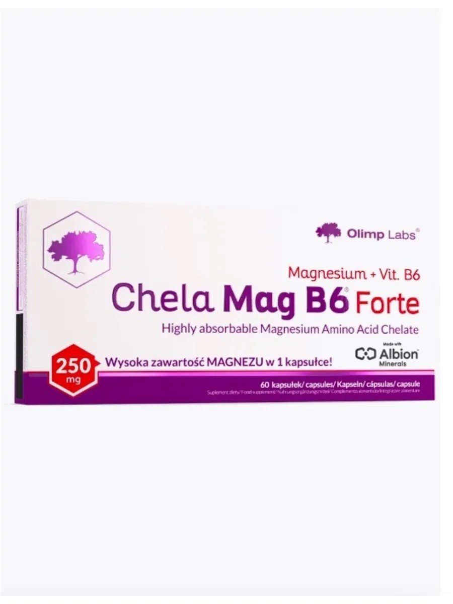 Olimp Chela-Mag B6 forte is a superior magnesium supplement that has won the ALBION gold medal. It contains the most easily absorbed form of magnesium: an amino acid chelate (magnesium bisglycinate) in an increased dosage of 1390 mg of magnesium chelate per capsule. Additionally, the supplement is enriched with vitamin B6, which, together with magnesium, participates in metabolic processes and enhances the effect. The supplement helps satisfy the need for magnesium - it is essential during intense strength training, participates in energy processes, post-workout regeneration, increases resistance to stress, improves the body's adaptive capacity, has a calming effect, and normalizes sleep without a sedative effect. Directions: Take 1 capsule 30-45 minutes before bedtime. Keep out of reach of children. We do not recommend using this dietary supplement for persons under 18 years of age. Consult a specialist before taking it!