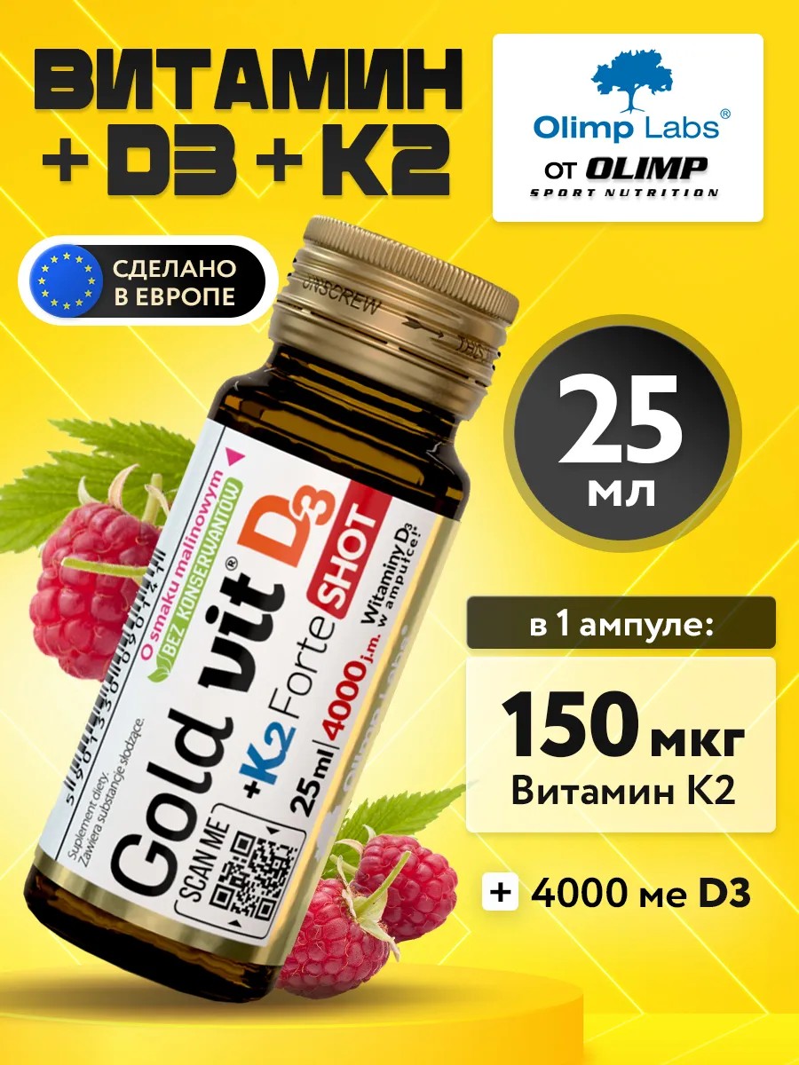 Олимп Лабс, Голд Вит Д3+K2, шот 25 мл, Малина, Olimp Labs, Gold Vit D3+K2, shot 25 ml, Raspberry.