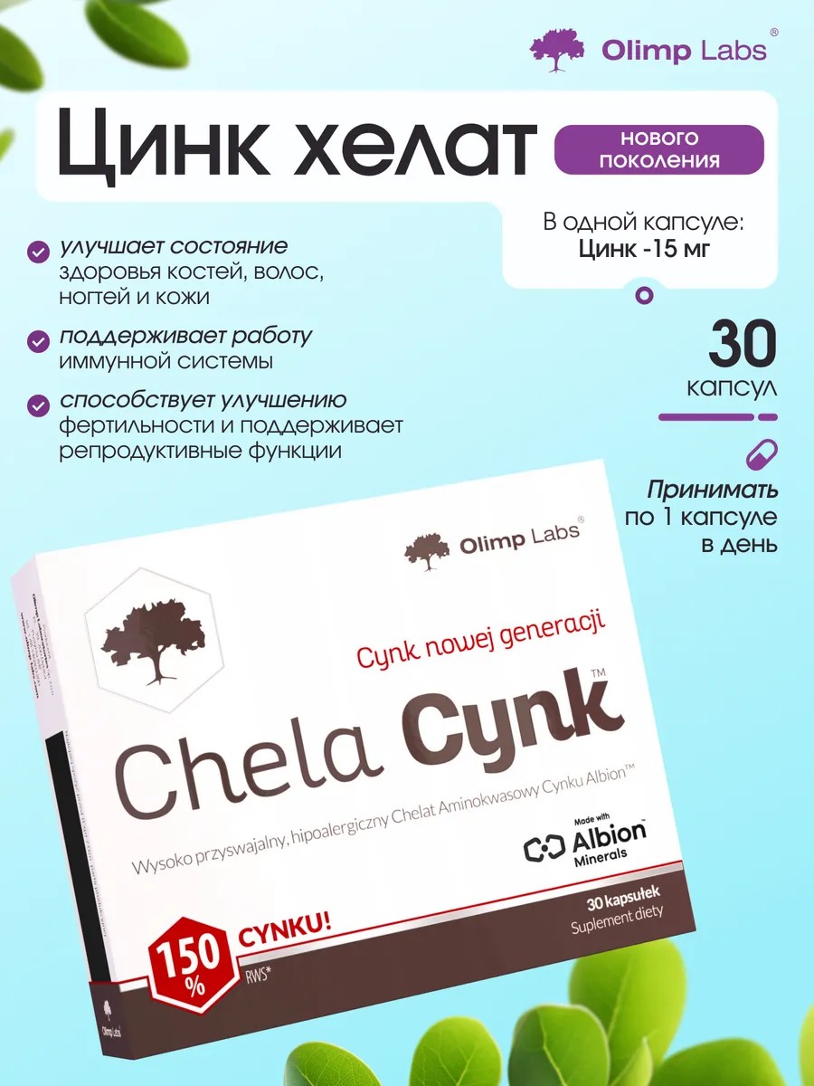 Olimp Labs, Хела-Цинк 15 мг, 30 капсул, Chela-Zinc 15 mg, 30 capsules – это пищевая добавка, содержащая бисглицинат цинка с высокой усвояемостью (аминокислотный хелат цинка Albion). ПОЛЬЗА: незаменим для правильного функционирования иммунной системы и правильного зрения; участвует в поддержании нормальной фертильности и размножения, а также нормального уровня тестостерона; необходим в синтезе белков и метаболизме питательных веществ, а также в поддержании нормального кислотно-щелочного обмена; способствует поддержанию нормального метаболизма жирных кислот, защищает компоненты клеток от окислительного повреждения; обеспечивают надлежащее состояние костей; помогают поддерживать надлежащий внешний вид кожи, волос и ногтей. Этот минерал играет важную роль для организма, помогает поддерживать здоровье сердца, глаз, суставов и нервной системы. Цинк по праву называют «элементом красоты», он активно участвует в процессе регенерации и обновления кожи, стимулирует синтез коллагена и кератина, влияя на рост ногтей и волос, защищая их от выпадения. Незаменимый для мужчин vitamin элемент, естественным путем стимулирующий повышение уровня тестостерона – гормона, отвечающего за полноценную работу половых функций, потенцию и здоровый внешний вид. Капсулы хелатного цинка одинаково полезны для взрослых мужчин и женщин, девушек и подростков. Цинк – витамин помощник при лечении дерматологических проблем. Он активно участвует в очищении и улучшении состояния кожи лица, предотвращает появление прыщей, которые могут повлиять на внешний вид и баланс настроения. Этот спортивный комплекс питания (спортпит) влияет на регуляцию аппетита и помогает контролировать balance веса, что будет особенно полезно для тех, кто стремится к похудению. Минеральный complex помогает увеличить массу и мышцы, а также способствует восстановлению формы спортсменов после тренировок. Комплексный minerals будет отличным подарком для человека, который поддерживает зож и активный образ жизни. Уникальная формула капсул цынк – это эффективное антистресс средство, предназначенное для поддержки нервов. Zink хилат имеет успокоительное и противовирусное действие, противостоит стрессу. Обеспечивает нормальное функционирование мозга, улучшение зрения, памяти и качество сна. Если вы ищете натуральный препарат, который поможет улучшить общее состояние организма, поддержать силу мышц, сосуды, а также повысить иммунитет, энергию и возбуждение, то биодобавка Chela - Zinc – ваш выбор ПРИМЕНЕНИE: принимайте по 1 капсуле один раз в день во время еды. Не превышайте рекомендуемую суточную дозу. ПРЕДУПРЕЖДЕНИE: Проконсультируйтесь с врачом перед применением пищевых добавок, если вы проходите курс лечения от какого-либо заболевания, а также в период беременности и лактации. Хранить в плотно закрытой упаковке в сухом и прохладном месте, недоступном для детей.