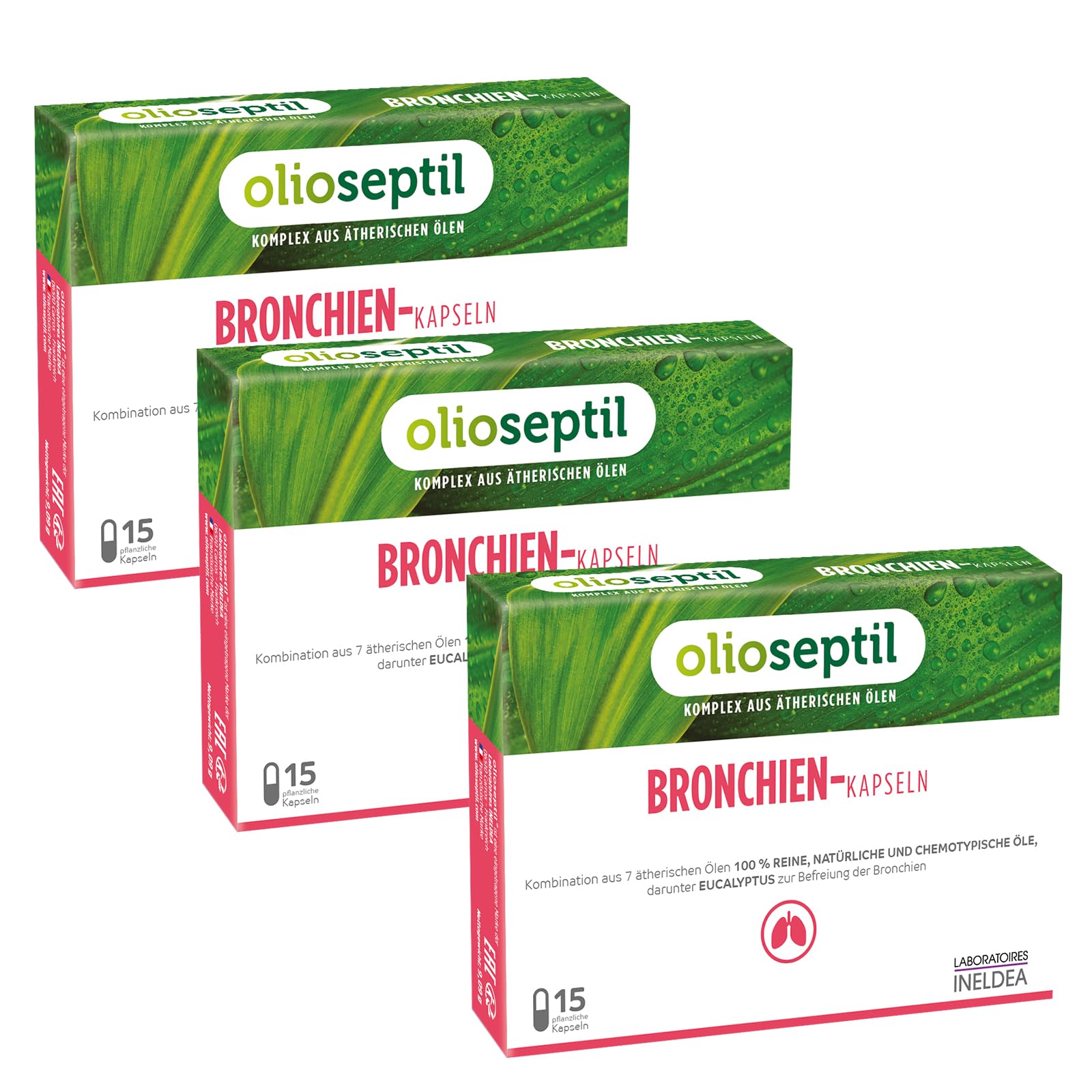 Olioseptil bronchi capsules contain a active ingredient complex from a combination of 7 essential, 100 % pure, chemotypical oils of natural origin, especially Eucalyptus Radiata, which helps to free the bronchi, as well as thyme and forest jaw, which contribute to the optimal function of the respiratory system.Productive active ingredient complex microemuled essential oils on a carrier made of olive oil from first cold pressing 100 % vegetable capsule patented L-VCAPS capsule, which protects the essential oils and better assimilates in order to achieve optimized effectiveness.Pack with 3 x 15 capsules Ingredients / ingredients Emulgator: Sojalecithin;Plant gelatin (hypromellosis);Synergetic complex of botanical and biochemically defined, 100 % pure essential oils: Eucalyptus Radiata (leaves), Cinnamomum Camphora (leaves), cinnamomum zeylanicum (bark), Myrtus Communis (branches), Origanum Majorana (flowering plant), thymus vulgaris (flowering plant), Pinus Sylvestris (needles);Olive oil from first cold pressing.Gluten free. Instructions 1 capsule in the morning, at noon and in the evening before meals for 5 days.In the event of susceptibility, for prevention: 1 capsule per day as a 15-day cure, which can be repeated several times a year. Warnings It is best to consume before the date specified on the packaging.Store outside the range of children and protected from heat and moisture.Consumption as part of a varied and balanced diet and a healthy lifestyle.The recommended consumption per day must not be exceeded.Only for adults from the age of 15.Not recommended for pregnant women and breastfeeding women without medical advice. More olioseptil, complex from essential oils: The product range of Olioseptil of the French laboratoryatoires ineldea offers ready -to -ready solutions for natural health with which you can safely use the power of essential oils.Application instructions: Take 1 capsule for 5 days in the morning, at noon and in the evening before meals.Alternatively, you can also take 1 capsule per day as a 15-day cure that you can repeat several times a year to prevent respiratory problems.High-quality essential oils: The safe and carefully dosed essential oils of the Olioseptil product series are 100 % pure and natural, botanically defined and chemotyped (HECT).Patented L-VCAPS technology: The 100 % vegan, patented vegetable L-VCAPS capsules protect the essential oils and promote their assimilation for optimized effectiveness.To liberate the bronchi: the bronchy capsules contain a complex of 7 essential oils, including from Eucalyptus Radiata to support the respiratory tract and help to liberate the bronchi. Olioseptil Bronchien-Kapseln enthalten einen Wirkstoffkomplex aus einer Kombination von 7 ätherischen, 100 % reinen, chemotypischen Ölen natürlichen Ursprungs, insbesondere Eucalyptus radiata, der hilft, die Bronchien zu befreien, sowie Thymian und Waldkiefer, die ergänzend zur optimalen Funktion des Atmungssystems beitragen. Gebrauchsfertiger Wirkstoffkomplex Mikroemulgierte ätherische Öle auf einem Träger aus Olivenöl aus erster Kaltpressung 100 % pflanzliche Kapsel Patentierte L-Vcaps-Kapsel, die die ätherischen Öle schützt und besser assimiliert, um eine optimierte Wirksamkeit zu erzielen. Packung mit 3 x 15 Kapseln INHALTSSTOFFE / ZUTATEN Emulgator: SOJALECITHIN; Pflanzliche Gelatine (Hypromellose); Synergetischer Komplex aus botanisch und biochemisch definierten, 100 % reinen ätherischen Ölen: Eucalyptus radiata (Blätter), Cinnamomum camphora (Blätter), Cinnamomum zeylanicum (Rinde), Myrtus communis (Zweige), Origanum majorana (blu¨hende Pflanze), Thymus vulgaris (blu¨hende Pflanze), Pinus sylvestris (Nadeln); Olivenöl aus erster Kaltpressung. Glutenfrei. GEBRAUCHSANWEISUNG 1 Kapsel morgens, mittags und abends vor den Mahlzeiten 5 Tage lang. Bei Anfälligkeit, zur Vorbeugung: 1 Kapsel pro Tag als 15-Tage-Kur, die mehrmals im Jahr wiederholt werden kann. WARNHINWEISE Am besten vor dem auf der Verpackung angegebenen Datum verbrauchen. Außerhalb der Reichweite von Kindern und vor Hitze und Feuchtigkeit geschu¨tzt aufbewahren. Verzehr im Rahmen einer abwechslungsreichen und ausgewogenen Ernährung und eines gesunden Lebensstils. Die empfohlene Verzehrmenge pro Tag darf nicht u¨berschritten werden. Nur fu¨r Erwachsene ab 15 Jahren. Fu¨r schwangere und stillende Frauen ohne ärztlichen Rat nicht empfohlen. MehrOLIOSEPTIL, KOMPLEX AUS ÄTHERISCHEN ÖLEN: Die Produktreihe OLIOSEPTIL der französischen Laboratoires INELDEA bietet gebrauchsfertige Lösungen für die natürliche Gesundheit, mit denen Sie die Kraft ätherischer Öle bedenkenlos für sich nutzen können. ANWENDUNGSHINWEISE: Nehmen Sie 5 Tage lang morgens, mittags und abends vor den Mahlzeiten 1 Kapsel. Alternativ können Sie auch 1 Kapsel pro Tag als 15-Tage-Kur einnehmen, die Sie mehrmals im Jahr wiederholen können, um Atemwegsbeschwerden vorzubeugen. HOCHQUALITATIVE ÄTHERISCHE ÖLE: Die sicheren und sorgfältig dosierten ätherischen Öle der OLIOSEPTIL-Produktreihe sind zu 100 % rein und natürlich, botanisch definiert und chemotypisiert (HECT). PATENTIERTE L-VCAPS-TECHNOLOGIE: Die 100 % veganen, patentierten pflanzlichen L-Vcaps-Kapseln schützen die ätherischen Öle und fördern ihre Assimilation für eine optimierte Wirksamkeit. ZUR BEFREIUNG DER BRONCHIEN: Die Bronchien-Kapseln enthalten einen Komplex aus 7 ätherischen Ölen, darunter aus Eukalyptus Radiata zur Unterstützung der Atemwege und hilft zur Befreiung der Bronchien.OLIOSEPTIL – Bronchien-Kapseln – Reine und chemotypische ätherische Öle in pflanzlichen Kapseln L-Vcaps – Ab 15 Jahren – Hilft, die Bronchien zu befreien und die Atemwege zu beruhigen – 3 x 15 Kapseln 15 stück (3er Pack)