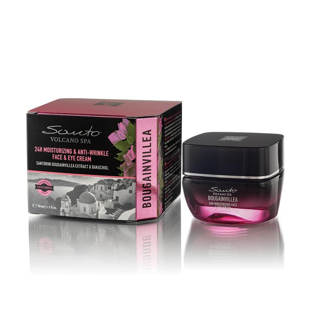 Discover the Santo Volcano Spa Bougainvillea 24-hour moisturizing and anti-wrinkle face and eye cream. This luxurious formula, enriched with Santorini Bougainvillea extract and highly effective ingredients such as hyaluronic acid and bakuchiol, provides intensive 24-hour hydration for your skin. The innovative combination visibly reduces wrinkles, reduces dark circles and bags under the eyes, while simultaneously providing the skin with moisture. The cream leaves a smooth, supple skin surface and is suitable for all skin types. The contained Marine Bluevital C-Complex and sea buckthorn extract support the nourishing effect. Use: Apply morning and evening to cleansed facial skin and around the eyes. The 50 ml formula has been dermatologically tested and is intended for external use. INSTRUCTIONS FOR USE adults SAFETY WARNING For external use only See morePractical use: 50 ml cream consistency for easy distribution over face and eyes. Universal use: suitable for all skin types and dermatologically tested, ideal for daily morning and evening care. EYE CARE: Specially developed to reduce dark circles and bags in the sensitive eye area. Innovative formula: combines hyaluronic acid and Bakuchiol for optimal skin care and visible wrinkle reduction. 24-HOUR HYDRATION: Enriched with Santorini Bougainvillea extract for long-lasting hydration and supple skin.Santo Volcano Spa Bougainvillea 24H vocht- en anti-rimpel gezichts- en oogcrème, 50 ml, met bougainvillea-extract Ontdek de Santo Volcano Spa Bougainvillea 24-uurs vochtinbrengende en anti-rimpel gezichts- en oogcrème. Deze luxe formule, verrijkt met Santorini-Bougainvillea-extract en zeer effectieve ingrediënten zoals hyaluronzuur en bakuchiol, biedt een intensieve 24-uurs hydratatie voor je huid. De innovatieve combinatie vermindert zichtbaar rimpels, vermindert donkere kringen en wallen onder de ogen, terwijl het de huid tegelijkertijd met vocht verzorgt. De crème laat een glad, soepel huidoppervlak achter en is geschikt voor alle huidtypes. De aanwezige Marine Bluevital C-Complex en duindoornextract ondersteunen de voedende werking. Gebruik: 's ochtends en 's avonds aanbrengen op de gereinigde gezichtshuid en rond de ogen. De 50 ml formule is dermatologisch getest en is bedoeld voor uitwendig gebruik. GEBRUIKSAANWIJZING volwassenen VEILIGHEIDSWAARSCHUWING Alleen voor uitwendig gebruik Meer bekijkenPraktisch gebruik: 50 ml crèmeconsistentie voor een gemakkelijke verdeling over gezicht en ogen. Universeel gebruik: geschikt voor alle huidtypes en dermatologisch getest, ideaal voor dagelijkse ochtend- en avondverzorging. VERZORGING VAN DE OOGPARTIJ: Speciaal ontwikkeld om donkere kringen en wallen in de gevoelige oogpartij te verminderen. Innovatieve formule: combineert hyaluronzuur en Bakuchiol voor optimale huidverzorging en zichtbare rimpelvermindering. 24-UUR HYDRATATIE: Verrijkt met Santorini-Bougainvillea-extract voor langdurige hydratatie en soepele huid.