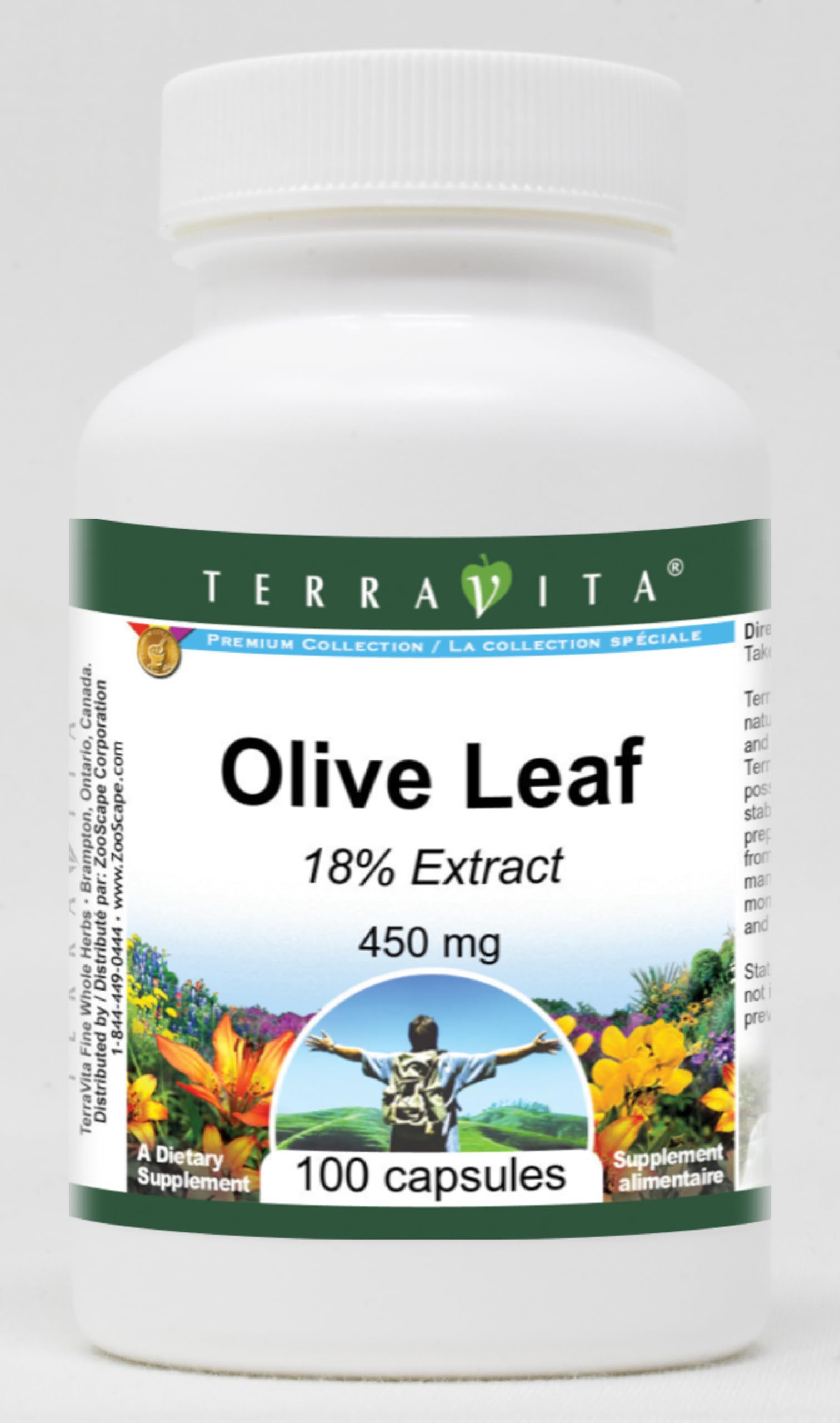 Olive Leaf 18 - 450 mg (100 capsules, ZIN: 521789) Packaged in the United States in a cGMP certified facility (current Good Manufacturing Practice). No fillers. Manufacturer: TerraVita Size: 100 capsules Easy-to-swallow Capsules in a sealed bottle. Ingredients: Gelatin, Water, Olive Leaf 18 Extract - 450 mg