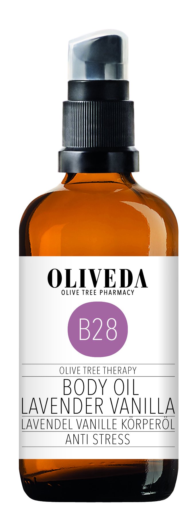 Oliveda B28 - Körperöl Lavendel Vanille Anti Stress natürliches Pflegeöl Pflege und Schutz vor Trockener haut regenerierend beruhigend - 100 ml