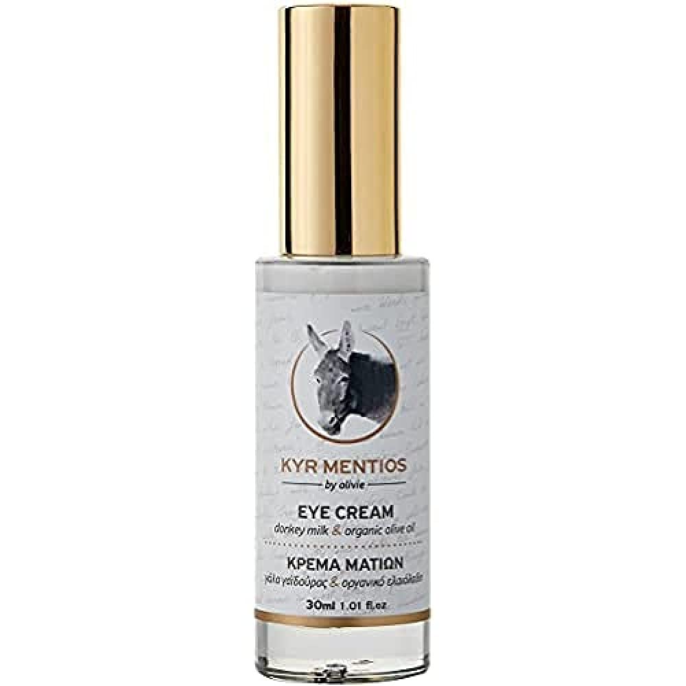 Kyr Mentios Donkey Milk Eye Cream 30ml.fl.oz 30 ml. Dermatologically tested. Directions: Apply a small amount morning and evening around the eye area. Provides an immediate tightening effect, fading dark circles and soothing crow's feet wrinkles. Vitamins and donkey milk proteins combined with peptides and plant extracts. Crème Yeux Kyr Mentios Lait d'Âne 30ml.1fl.oz 30ml. Testé dermatologiquement. Utilisation : Appliquer une petite quantité matin et soir autour du contour des yeux. Fournit un effet de serrage immédiat, la décoloration du cercle sombre et apaisante des rides des pattes d'oie. Vitamines et protéines de lait d'âne combinées avec des peptides et des extraits de plantes.