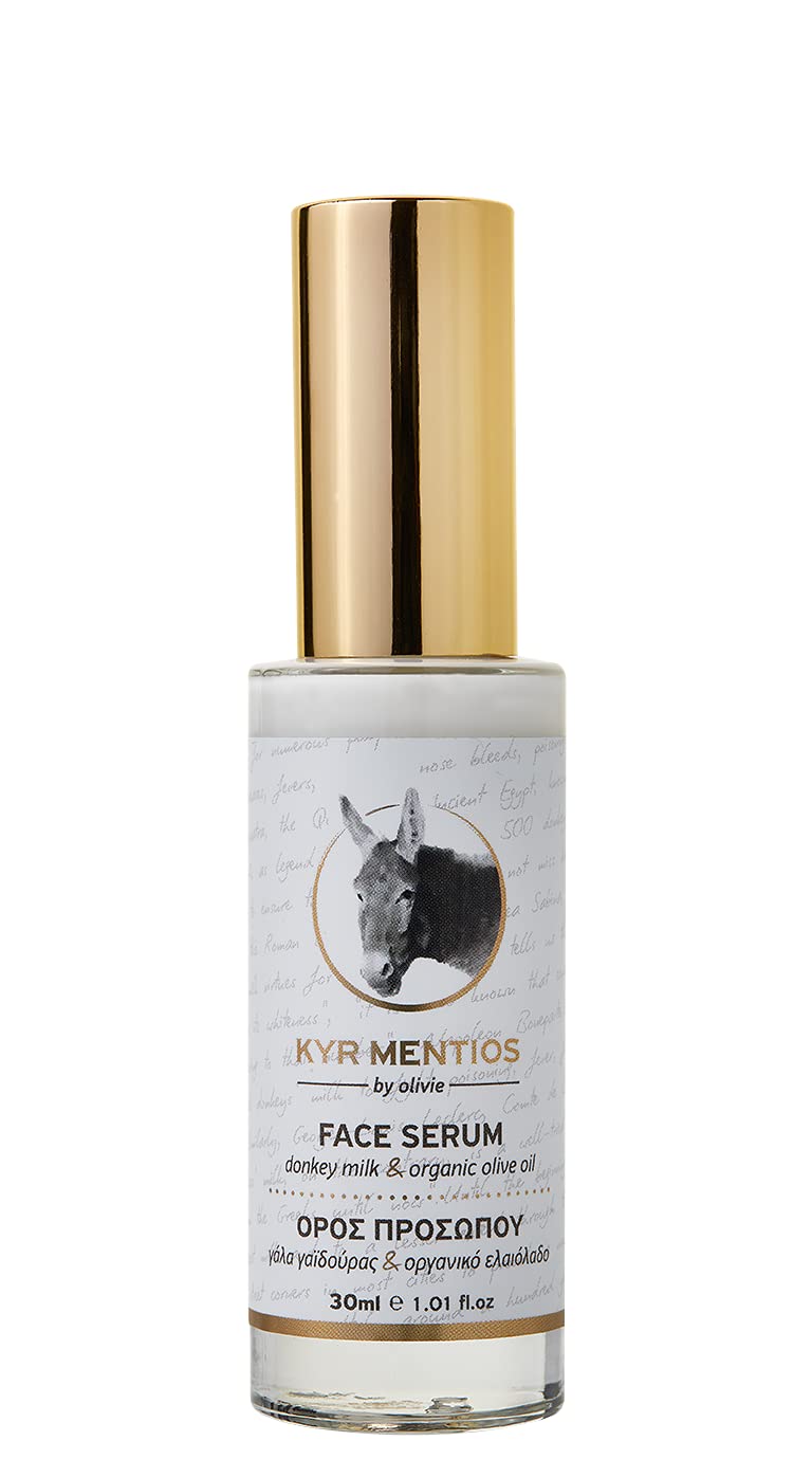 Kyr Mentios Donkey Milk Face Serum 30ml.Package Weight: 122.0 grams. 1 fl.oz, 30ml. Dermatologically tested. Contains donkey milk, rich in vitamins and proteins that nourish, moisturize, and restore skin, leaving it healthy and radiant, as well as oligopeptides that smooth fine lines and wrinkles. Facial serum with a specialized formula and a silky feel. Sérum visage Kyr Mentios Lait d'âne 30ml.Poids du colis: 122.0 grammes. 1fl.oz, 30ml. Testé dermatologiquement. Contient du lait d'âne riche en vitamines et protéines qui nourrissent, hydratent et restaurent la peau en la laissant saine et rayonnante ainsi que des oligopeptides qui lissent les ridules et les rides. Sérum facial avec formule spécialisée et sensation soyeuse.
