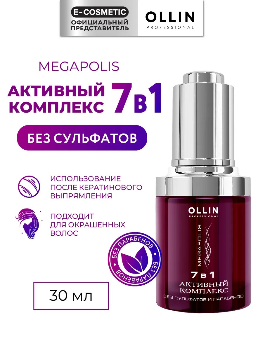 Сыворотка активный комплекс MEGAPOLIS 7 в 1 OLLIN создана для глубокого восстановления ослабленных, окрашенных, осветленных и повреждённых волос, которым требуется интенсивный уход. Уникальная формула сочетает ценные аминокислоты, протеины, кератин и эластин, которые восполняют утраченные питательные вещества, возвращают локонам прочность и упругость. Увлажняющий компонент вместе с пантенолом насыщает влагой и удерживает её внутри, предотвращая сухость и ломкость. Белковые соединения укрепляют волосяную структуру, делая её более плотной и эластичной, а кератин разглаживает поверхность, придавая естественный блеск и мягкость. Комплекс действует сразу в нескольких направлениях: защищает цвет после окрашивания, стимулирует рост, укрепляет корни, уменьшает ломкость и пушистость, запечатывает секущиеся концы, усиливает плотность и эластичность. Волосы становятся послушными, сохраняют форму и выглядят ухоженными. В результате волосы приобретают шелковистость, сияние, становятся заметно плотнее, сильнее и здоровее, легко расчесываются, не теряют цветовую насыщенность и выглядят ухоженными.