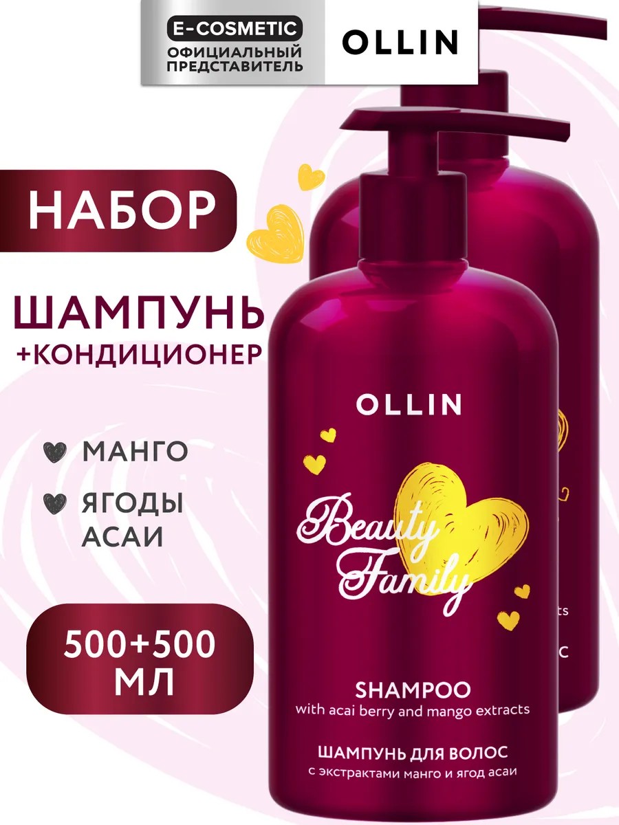 Набор с экстрактами манго и ягод асаи BEAUTY FAMILY для питания и сияния волос. Сбалансированный уход на каждый день для тусклых, уставших и безжизненных волос. Экстракты манго и асаи насыщают полезными веществами, возвращают блеск и силу. Формула шампуня и кондиционера Ollin подобрана так, чтобы обеспечить мягкое очищение, питание и восстановление без утяжеления. Шампунь Оллин 500 мл деликатно очищает кожу головы и волосы, не пересушивая. Натуральные экстракты наполняют волосы влагой и витаминами, делая их мягкими и сияющими. Кондиционер 500 мл дополняет действие шампуня — разглаживает, облегчает расчёсывание и сохраняет эластичность. Увлажняющие добавки обеспечивают ухоженный вид и естественный блеск. Рекомендован для нормальных, сухих, окрашенных и обезвоженных волос. Уходовый набор подходит как для женщин, так и для мужчин, для мальчиков и девочек.