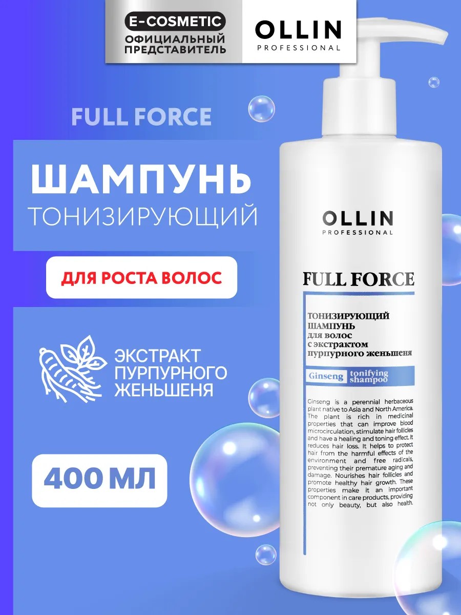 Профессиональный тонизирующий шампунь OLLIN против выпадения FULL FORCE разработан для тех, кто стремится укрепить корни, очистить кожу головы и запустить рост волос. Подходит для всех типов, особенно ослабленных, склонных к выпадению. Благодаря мягкой моющей основе он деликатно удаляет загрязнения, не нарушая естественный баланс. Экстракт пурпурного женьшеня — природный компонент, известный тонизирующими и восстанавливающими свойствами —улучшает питание волосяных луковиц. Комплекс пептидов активизирует микроциркуляцию, поддерживает здоровье кожи головы и стимулирует рост новых прядей. Подходит для регулярного ухода. Уже после первого применения появляется ощущение свежести, корни укрепляются, волосы становятся плотнее, снижается ломкость, появляется живой блеск, облегчает расчесывание. Регулярное использование способствует восстановлению густоты, делает пряди сильными и устойчивыми к внешним воздействиям.