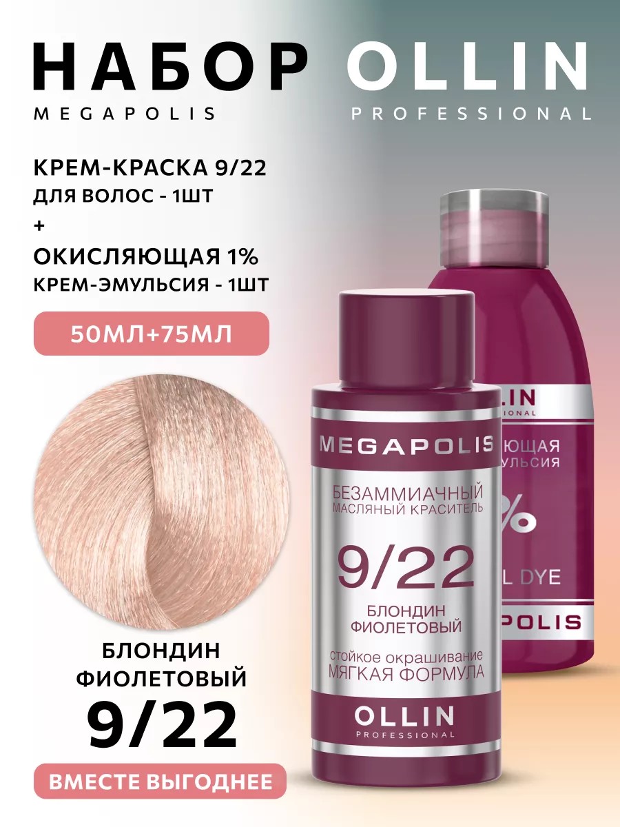 КомплектацияКраска для волос Megapolis 9/22; Ollin Окисляющая крем-эмульсия Megapolis 1% 75 мл