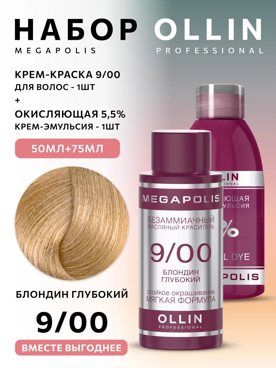 Package contentsMegapolis 9/00 Deep blond dye; Ollin Megapolis Oxidizing Cream-Emulsion 55% 75 ml