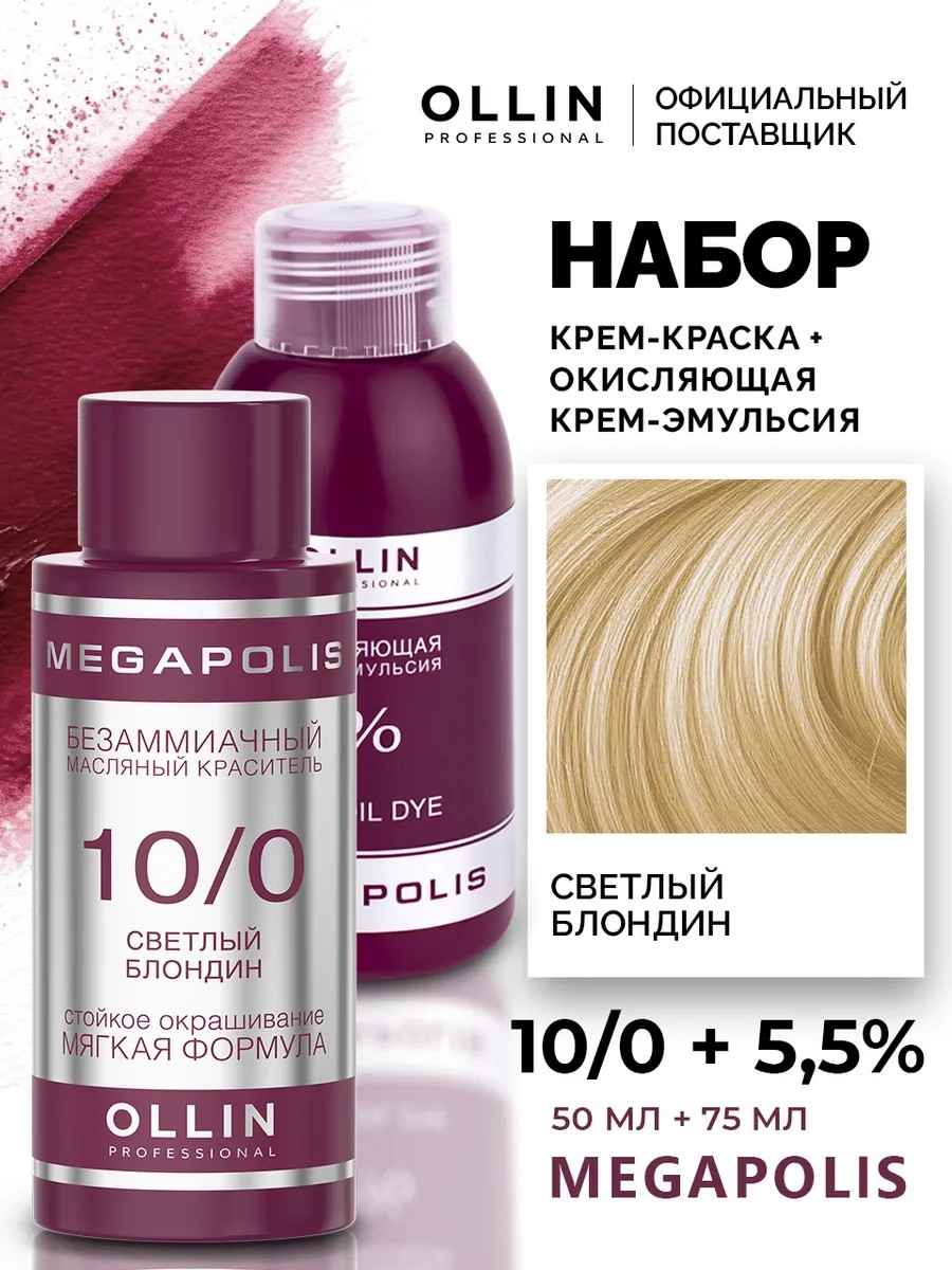 Package contentsHair dye Megapolis 10/0 Light Blond 50 ml; Ollin Oxidizing Cream-Emulsion Megapolis 55% 75 ml