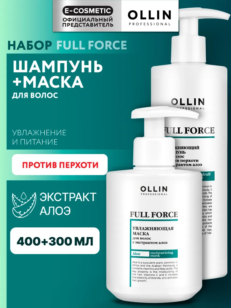 Профессиональный набор OLLIN FULL FORCE с экстрактом алоэ входит шампунь FULL FORCE против перхоти 400 мл и маска для увлажнения и питания волос 300 мл.