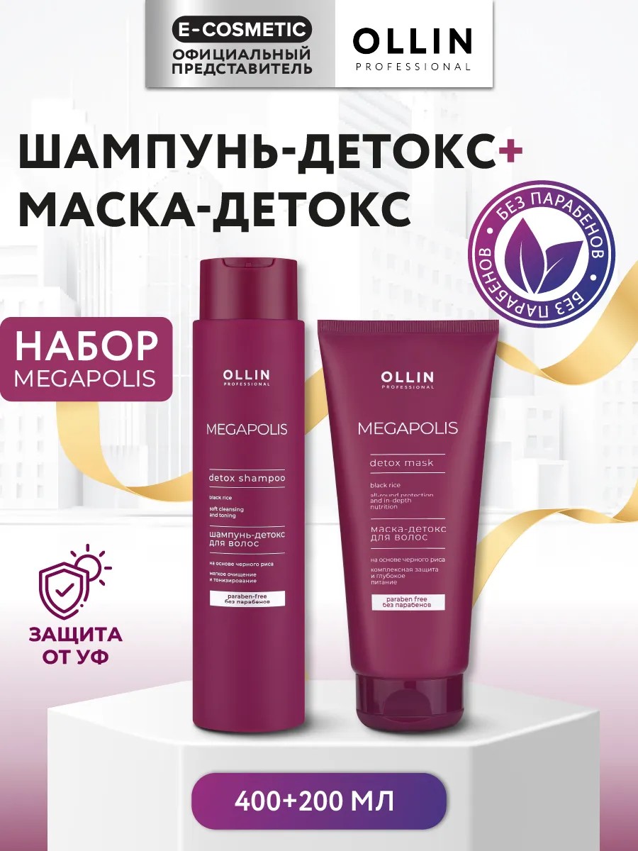 Профессиональный набор шампунь и маска для волос OLLIN MEGAPOLIS с экстрактом чёрного риса детокс-уход для глубокой очистки и интенсивного восстановления волос, подверженных агрессивному воздействию городской среды.