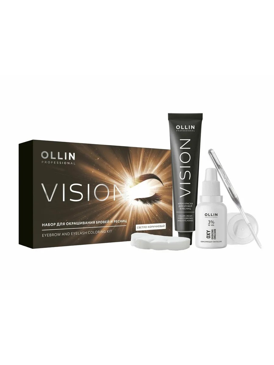 Russian cosmetics brand OLLIN Professional offers a set for tinting eyebrows and eyelashes, Vision Color Cream For Eyebrows And Eyelashes. This professional cosmetic provides high-quality, even coloring with results lasting up to six weeks.