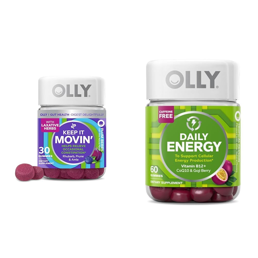 The bundle includes 30 berry-flavored Keep It Movin' gummies plus 60 tropical-flavored Daily Energy gummies. Both gummies feature delicious natural fruit flavors and are gluten-free. The Daily Energy gummies help fuel steady, renewable energy with B12, CoQ10, and goji berry, without any caffeine. . The Keep It Movin' gummies provide gentle overnight relief for occasional constipation with a blend of rhubarb, prunes, and amla. . These gummies combine OLLY's digestive and energy support into one convenient bundle, fueling your body from the inside out. .