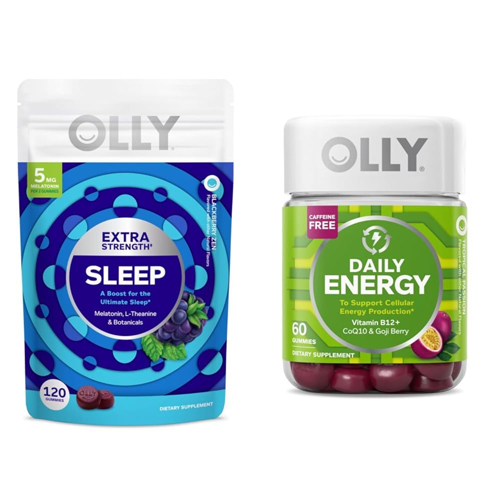 The OLLY Extra Strength Sleep and Daily Energy gummy bundles are the perfect combination to help you power through your days and get the rest you need at night. The OLLY Extra Strength Sleep gummies contain a powerful 5mg melatonin blend to help boost your natural sleep hormone. With the addition of L-theanine and botanicals like chamomile, passionflower and lemon balm, these gummies calm the mind and senses to pave the way for relaxation and restful sleep. Flavored with blackberry and mint, they come in a convenient 120-count pouch. To complement your sleep routine, the OLLY Daily Energy gummies provide steady, renewable energy without any caffeine. These tropical passion-flavored gummies contain essential B12 for cellular energy production, CoQ10 to support your energy-producing mitochondria, and antioxidant-rich goji berry. With 60 gummies per bottle, this is an ideal companion to take during the day while using the Extra Strength Sleep gummies at night. Together, these two OLLY products work synergistically to help you sleep soundly and wake up feeling refreshed and energized. The sleep gummies relax both body and mind for restful slumber, while the energy gummies fuel your cells to power you through the demands of your days. This bundle offers the best of both worlds—high quality rest and steady energy—to help you perform at your best.