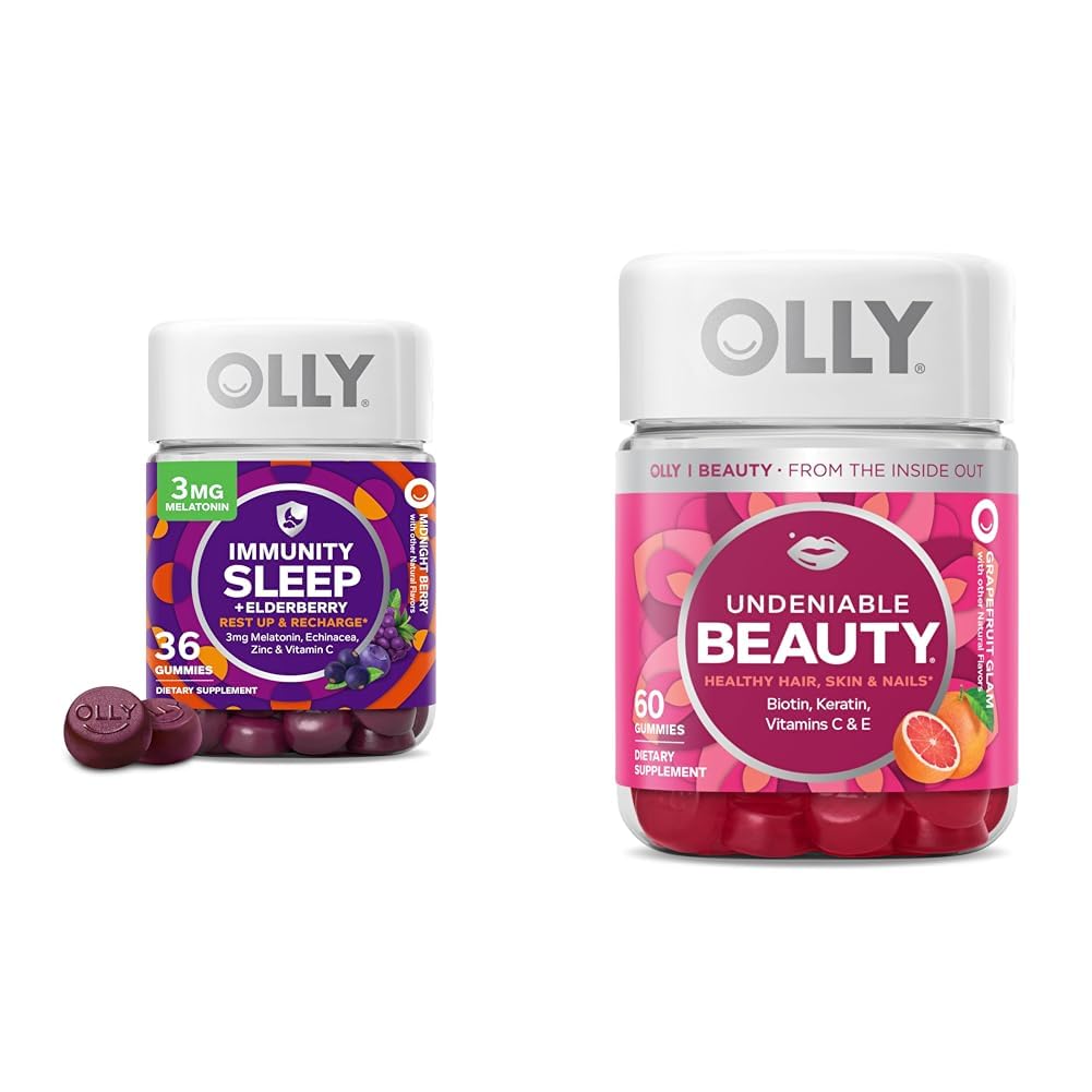NATURALLY DELICIOUS: OLLY gummies come in naturally flavored jammy berry and grapefruit glam flavors with no artificial colors or flavors and are gluten free. HOW TO TAKE: Chew two OLLY Immunity Sleep gummies 30 minutes before bed Chew two OLLY Undeniable Beauty gummies anytime, no food or water needed. THE GOODS INSIDE: Biotin is an essential nutrient to support healthy hair and nails. Vitamin C is a key nutrient in the production of collagen and Keratin helps nourish hair. . OLLY UNDENIABLE BEAUTY: Delicious OLLY beauty gummies are packed with the perfect blend of active ingredients to help keep your hair and nails in tip-top shape and your skin shining bright. . OLLY IMMUNITY SLEEP ELDERBERRY: Sleep is vital for a healthy immune system, so it's important to get your ZZZ's This powerful sleep combo Elderberry encourages sound, restorative slumber and a strong immune system.