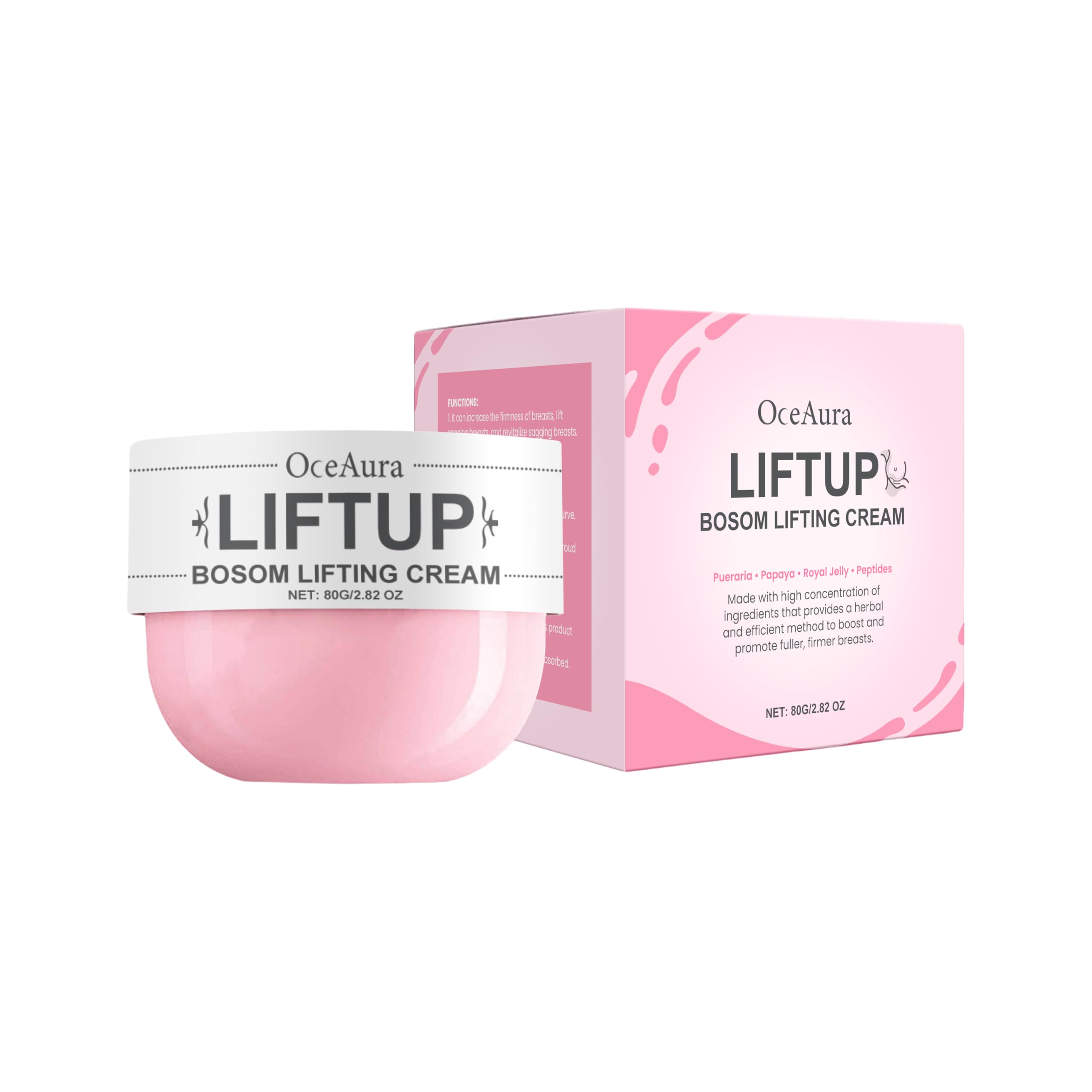 Product size: 6.5 4.8cm. Packaging size: 6.8 6.8 5.1cm. Ingredients: Papaya Extract, Royal Jelly, Acetyl Tripeptide-1. Gross weight: 114g. Product name: Kudzu Papaya Breast Firming Cream. Net content: 80g.