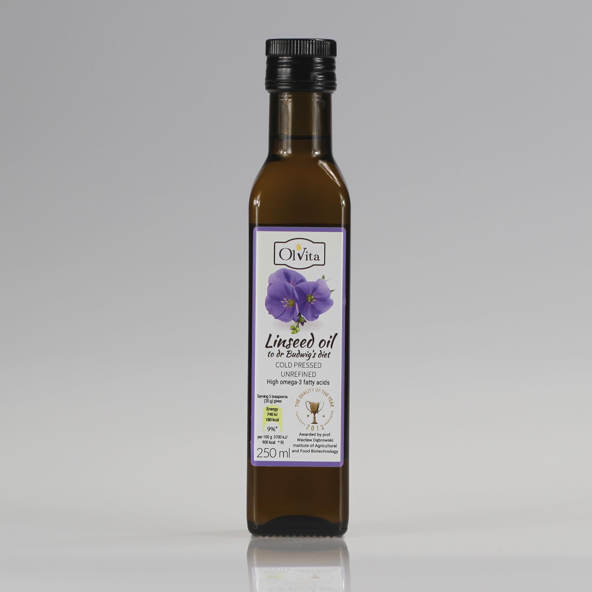 Description: Budwig Flaxseed Oil, Cold-Pressed and Raw, 250 ml OLVITA - The ideal ratio of omega-3 to omega-6 fatty acids. - Contains unsaturated fatty acids. - Supports the circulatory system. - Supports the immune system. - Contains vitamin E, an antioxidant. Ingredients 100 Cold-Pressed Unrefined Flaxseed Oil. Energy Value per 100 g of product: 900 kcal 3700 kJ Nutritional Value per 100 g of product: Protein – 0 g, Carbohydrates – 0 g, Fat: 100 g Ingredients: OMEGA-3: 50-62 , OMEGA-6: 16 Use: For direct consumption, 2 to 8 tablespoons per day, or as an addition to salads, salads, or other cold dishes. This oil can also be used according to the Budwig diet, in combination with low-fat cottage cheese and low-fat yogurt, and other supplements. Allergy Information: Gluten, sesame, soy, tree nuts: peanuts, hazelnuts, walnuts, macadamia nuts, almonds. Note: We use only raw, cold-pressed flaxseed oil. Valuable omega-3 fatty acids are very unstable and oxidize easily when products containing them are not stored under proper conditions. It should be kept refrigerated, preferably in a dark glass container, and away from light. Low-linolenic oils, meaning they contain a very small amount of omega-3 fats and a very high amount of omega-6 fats. Unfortunately, they don't have the same health benefits as the high-linolenic version. Storage: This oil should be stored in the refrigerator, tightly sealed with a lid. Directions for Use: Recommended for use in smoothies, shakes, and as a salad dressing. When cooking, use low to medium heat to preserve the oil's properties. Store in a cool, dry place, away from direct sunlight to prolong shelf life. Not suitable for high-temperature cooking methods such as deep frying. May contain allergens discontinue use if any adverse reactions occur.Ol'Vita : Huile de lin vierge - Huile de lin pressée à froid - Pure naturelle crue sans pesticides - Supplément diététique Dr. Budwig 250mlDESCRIPTION DU PRODUIT DESCRIPTION DU PRODUIT Description : Huile de graines de lin Budwig, pressée à froid et brute 250 ml OLVITA - Le bon rapport entre les acides gras oméga 3 et oméga 6. - Contient des acides gras insaturés. - Supporte le système circulatoire. - Supporte l'immunité. - Contient de la vitamine E, qui est un antioxydant. Ingrédients 100 huile de lin non raffinée pressée à froid. Valeur énergétique dans 100 g de produit : 900 kcal 3700 kJ Valeur nutritionnelle en 100 g de produit : protéines – 0, Glucides - 0 g, Graisses : 100 g. Compris : OMEGA-3 : 50-62 , OMEGA-6 : 16 Application : Pour la consommation directe en quantité de 2 à 8 cuillères à soupe par jour ou comme ajout à des salades, salades ou autres plats servis froids. Cette huile peut également être utilisée selon le régime du Dr. Budwig, en combinaison avec du fromage blanc maigre et du yaourt maigre et des additifs. Informations sur les allergies Gluten, sésame, soja, noix de coque: cacahuètes, noisettes, noix, noix de macadamia, amandes. Remarque : Nous utilisons uniquement de l'huile de lin cru à froid. Les acides oméga-3 précieux sont très instables et s'oxydent facilement lorsque les produits qui les contiennent ne sont pas stockés dans des conditions appropriées. Il doit être conservé au réfrigérateur, de préférence en verre foncé et à l'abri de la lumière. Huiles à faible teneur en linolénique, ce qui signifie qu'elles contiennent une très petite quantité de graisses oméga 3 et une très grande quantité de graisses oméga 6. Malheureusement, il n'a pas de propriétés aussi saines que la version à haut linolénique. Stockage : Cette huile doit être conservée au réfrigérateur, bien fermée avec un bouchon. MODE D'EMPLOI Recommandé pour une utilisation dans les smoothies, les shakes et comme garniture pour les salades. Pour la cuisson, utilisez un feu doux à moyen pour préserver les propriétés de l'huile. Conserver dans un endroit frais et sec, à l'abri de la lumière directe du soleil pour prolonger la durée de vie. Ne convient pas aux méthodes de cuisson à haute température comme la friture. Peut contenir des allergènes cesser l'utilisation en cas de réactions indésirables.