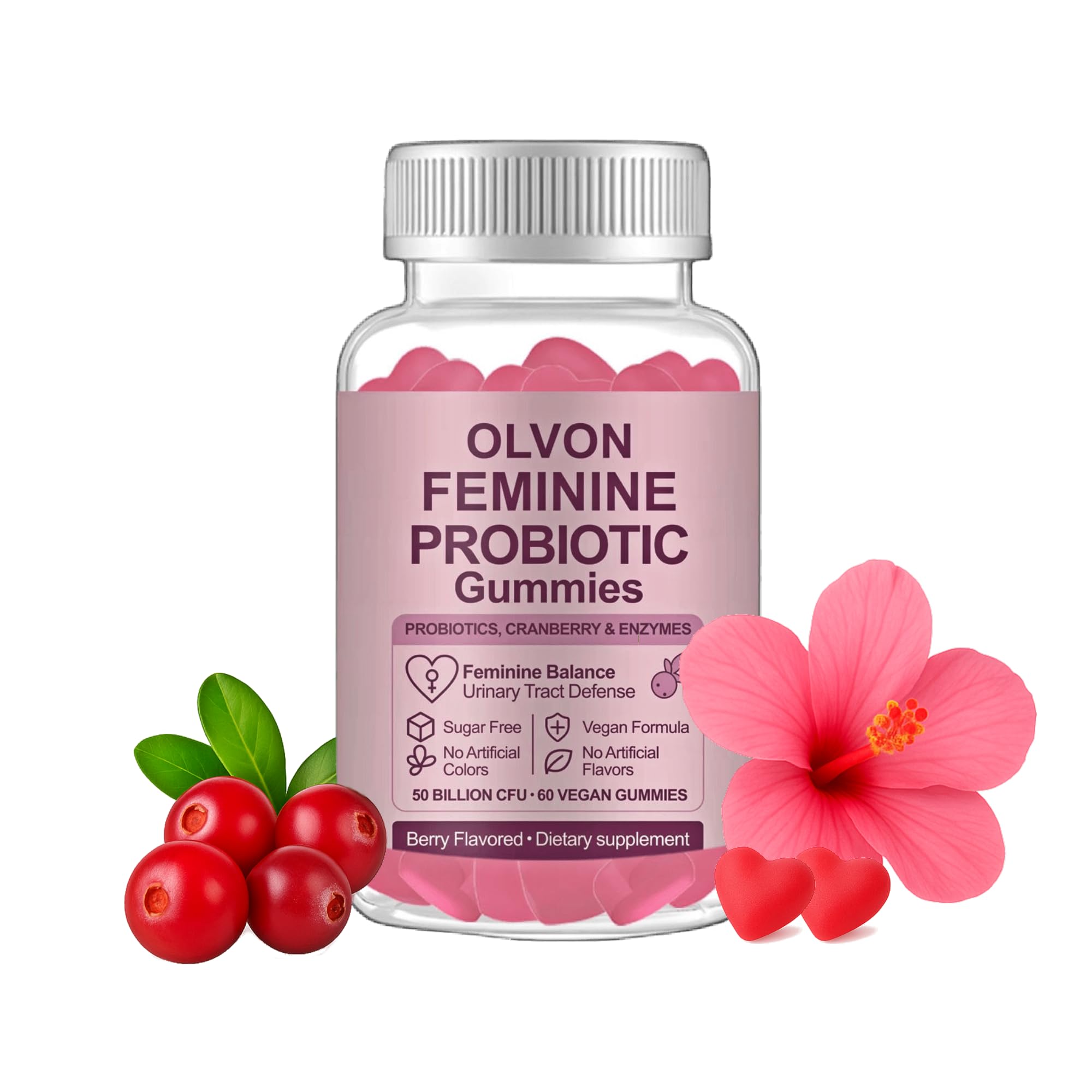 OLVON Feminine Probiotic Gummies - Vaginal Urinary Tract Health - 50 Billion CFU with Cranberry, Enzymes D-Mannose - Vegan, Sugar Free - Berry Flavor - 60 Gummies OLVON Feminine Probiotic Gummies are expertly crafted to support women's intimate health, including vaginal flora balance and urinary tract function. Each serving delivers 50 Billion CFU from clinically studied probiotic strains, combined with D-Mannose, Cranberry Extract, and plant-based digestive enzymes to promote healthy digestion, pH levels, and overall wellness. Whether you're seeking better balance or proactive defense, these vegan, sugar-free gummies provide an easy and delicious daily solution without compromising clean ingredients. Formulated for women. Loved by your body. Disclaimer: This product is not intended to diagnose, treat, cure, or prevent any disease. For adult use only.Delicious Easy to Take: Berry-flavored heart-shaped gummies designed for women. No pills, no hassle—just one delicious daily chewable. Vegan, Sugar-Free Clean Formula: Made with vegan ingredients, no added sugars, no artificial colors or flavors. Naturally sweetened with xylitol and erythritol. 50 Billion CFU 4 Blend System: Contains a powerful blend of probiotics, women's health botanicals, digestive enzymes, and prebiotics to enhance gut and immune health. Urinary Tract Health Defense: Includes D-Mannose and cranberry extract to support urinary tract function and help flush out unwanted bacteria naturally. Feminine Balance Wellness Support: Formulated with probiotics, cranberry, and enzymes to help promote vaginal flora balance, pH harmony, and daily feminine comfort.
