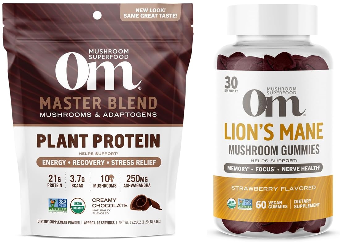 Full Line of Premium Mushroom Supplements: Try our full-line of premium mushroom powders, capsules, functional beverages, like coffee, and hot chocolate and savory broths to support overall health, immunity, focus, energy, beauty and performance. Lion's Mane Mushroom Gummies: Helps support memory, focus, nerve health, 1,000 mg whole Lion's Mane mushroom per serving. Master Blend Protein: This unique plant-based protein powder supplement from Om Mushroom Superfood offers a blend of 3 organic plant-based proteins, 10 organic whole food mushrooms plus 3 organic botanical adaptogens in one convenient powder to support your vibrant health. Contains: Master Blend Plant-Based Protein Powder, Creamy Chocolate and Lion's Mane Mushroom Gummies, Strawberry.