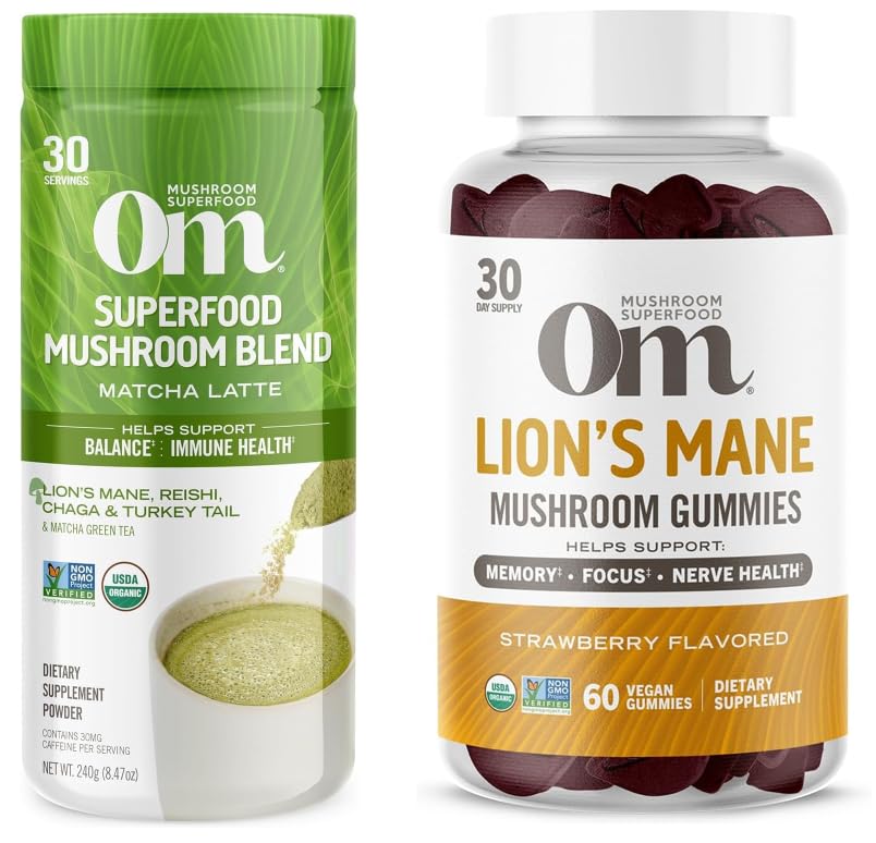 OM MUSHROOM SUPERFOOD Matcha Latte Blend Mushroom Powder 8.47 Ounce and Lion s Mane Mushroom Gummies 60 Count Strawberry Bundle