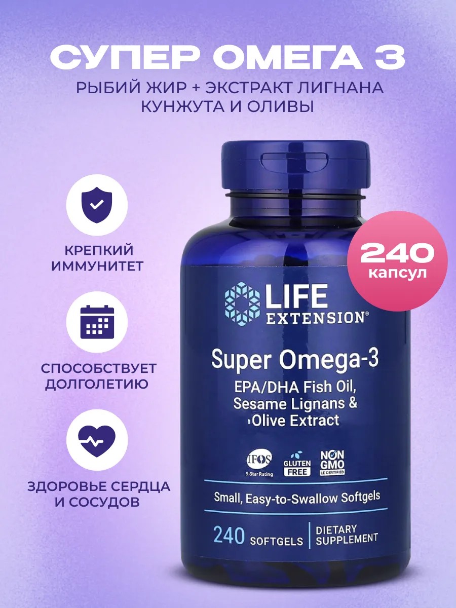 Торговое наименованиеБиологически активная добавка к пище SUPER OMEGA-3 Life Extension / СУПЕР ОМЕГА-3, капсулы по 1875 мг, №60, 120, 240