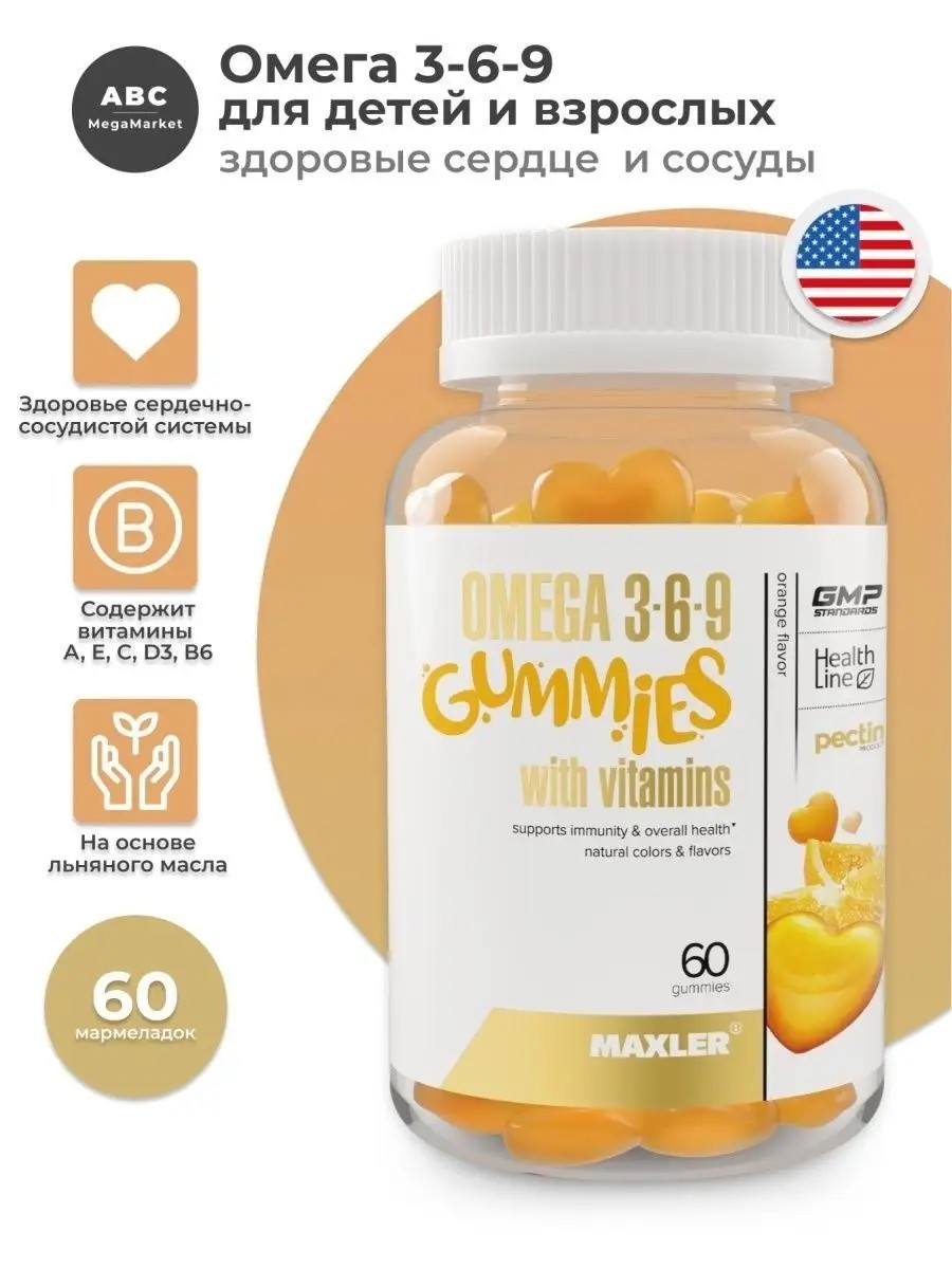 Omega 3-6-9 Gummies 60 шт Апельсин состоят из ингредиентов растительного происхождения подходят для взрослых и детей. Источником жирных кислот Омега 3-6-9 является льняное масло. БАД Омега оказывают поддержку сердечно-сосудистой и иммунной системам, а так же глазам, мозгу, коже. Регулярный прием Омегой-3 улучшает память и концентрацию, повышает работоспособность, снимает сухость в глазах при высоких зрительных нагрузках. Омега-6 укрепляет клеточного барьера, помогает защищать клетки от внешних повреждений. Омега-9 необходима для здоровья сердца и сосудов. 3 простых, удобных и вкусных жевательных пастилки позволяют получить всю пользу омега 3-6-9 жирных кислот. Каждая порция содержит антиоксидантные витамины C, E и A, а также витамины B6 и B3, которые естественным образом поддерживают иммунитет, пищеварение, костную систему и кожу. Витамин Д3 способствует здоровью костей, мышц и зубов. Витамин В6 необходим для углеводного обмена и вместе с витамином В3 участвует в работе нервной системы. Вам больше не надо гоняться за ребёнком с требованием принять витамины, жевательный мармелад дети просят сами. Рекомендации по применению взрослым и детям старше 4 лет принимать 1 порцию (3 пастилки) один раз в день. В линейке жевательных пастилок от Макслер есть детский витамин Д3 с К2, мультивитаминный комплекс, Омега для детей, кальций Д3 для детей, витамин С жевательный.