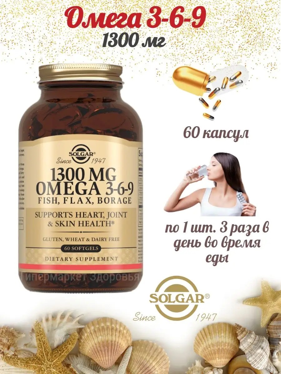 Комплекс жирных кислот 1300 мг Омега 3-6-9 Солгар (EFA 1300 mg Omega 3-6-9 Solgar) принимают как источник жирных кислот Омега-6, Омега-3, Омега-9. Эти кислоты крайне полезны для всего организма, укрепляют его иммунную защиту, придают красивый здоровый вид волосам и коже, насыщая их сиянием и укрепляя. Добавка оказывает защитное действие на сосуды и сердце, способствует лечению псориаза и экземы. Показания к применению комплекса жирных кислот 1300 мг Омега 3-6-9 Солгар (EFA 1300 mg Omega 3-6-9 Solgar): Сбои в работе сердца и сосудов. Проблемы с кожей. Проведение профилактики болезней нервной системы. Ухудшение состояния волос. Рекомендуется принимать по 1 капсуле трижды в день с едой.***Не является лекарством (бад). Перед применением бад проконсультируйтесь с врачом. Фото биологически активной добавки может отличаться от полученного вами товара, так как производитель вправе менять внешний вид упаковки.