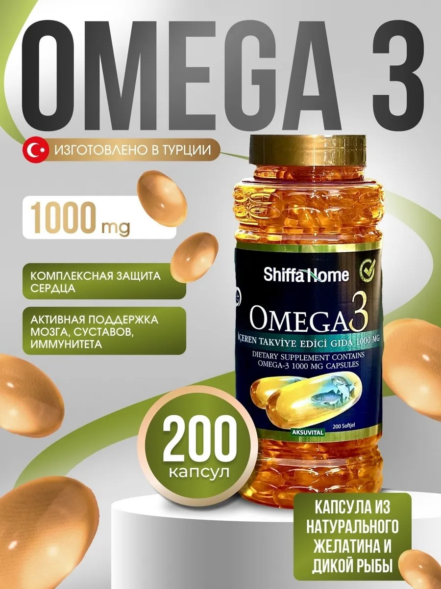 Fish oil capsules or Omega 3 vitamin 1000mg from the Turkish brand Shiffa Home. This package contains 200 Omega 3 capsules – a 100% premium animal-based supplement made from fish liver. Halal-certified medications from Turkey. Omega 3 contains natural fish oil with added EPA and DHA. 4 capsules contain pure omega-3, EPA, and DHA. It prevents the development of cardiovascular disease, lowers blood cholesterol, reduces and decreases blood clots, and prevents the onset and development of arrhythmia. Acids reduce the risk of diabetes. This medication is often prescribed for the treatment and prevention of tuberculosis, anemia, and night blindness. Regular intake also significantly improves brain function and provides the body with vitamins A and D, which have a beneficial effect on the skin, hair, and nails. Directions: For adults, take 2 capsules twice daily with meals. This vitamin complex for women's health supports immunity and prevents hair loss. This is one of the most basic supplements for a healthy and active lifestyle at any age. Combine it with other supplements: glucosamine and chondroitin chondroprotectors for joint and ligament health, and D3 for immune support. This premium, tasteless, odorless supplement strengthens both men's and children's health, nourishes joints and ligaments, bones and skin, nails, as well as the brain and eyes. It also supports depression and hair loss. It also helps boost daytime energy during weight loss. This supplement is an ideal gift for mom and dad, son and daughter, grandparents, or even a friend or colleague for sports. Marine oceanic omega-3 fatty acids are extracted from cod and salmon liver, enriched with liquid collagen and chlorophyll supplements. These are excellent, effective sports multivitamins. This dietary supplement contains natural ingredients, deionized water, bovine gelatin, and glycerin. Do not exceed the recommended dosage. This is not a substitute for a normal diet. Do not use for medicinal purposes. Consult a physician before use if you are pregnant, breastfeeding, taking medications, have any medical conditions, or are taking anticoagulants. The recommended daily dose of EPA and DHA should be at least 250 mg per day, and daily consumption should not exceed 3 g. Omega 3 1000 is the path to health and a stronger immune system. This fish oil is very easy to use. Omega 3 is important for the heart and blood vessels. 1000 mg of fish oil in each capsule.