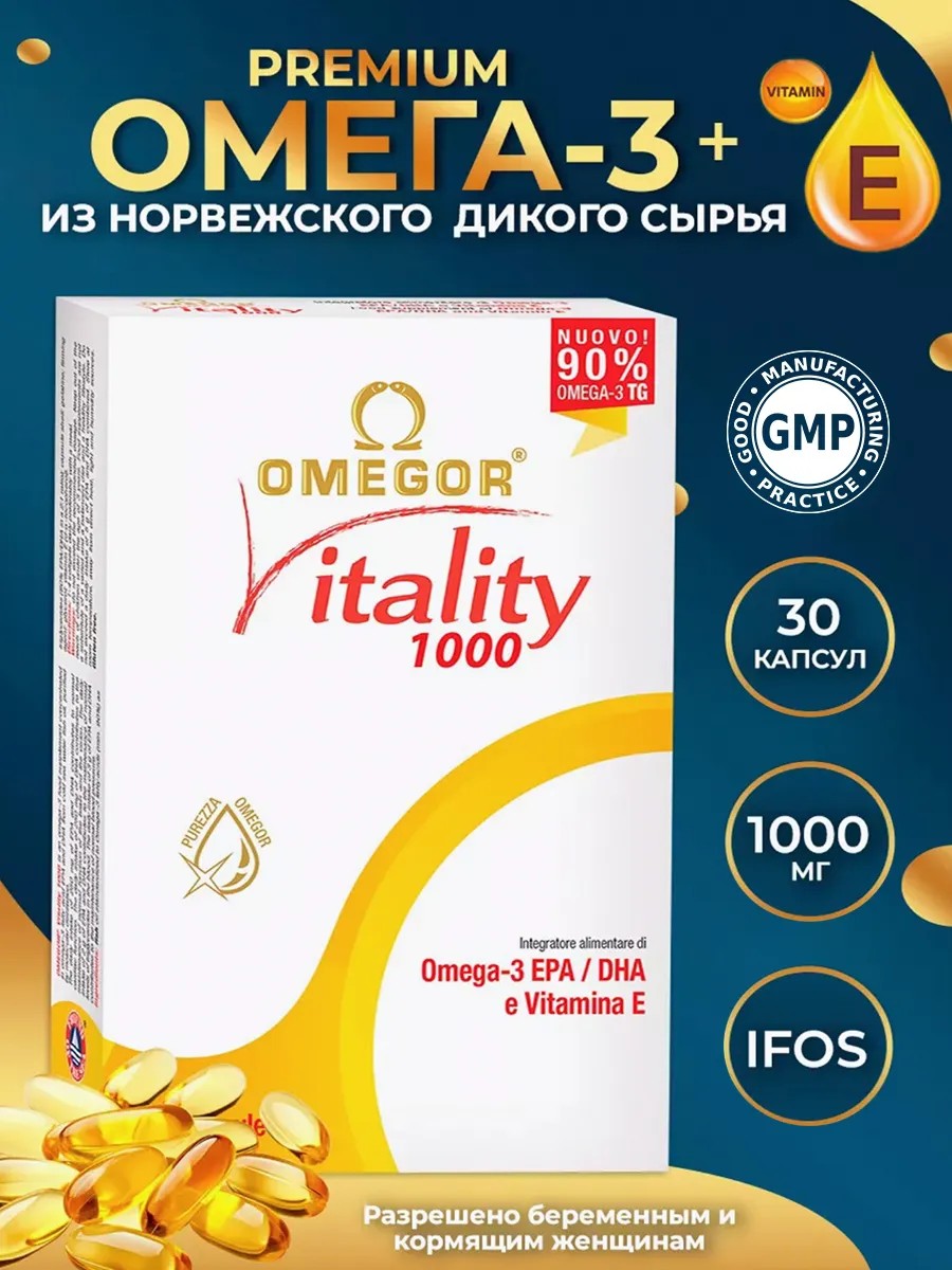 ВИТАЛИТИ 1000 30 капсул. Сырье северных диких пород рыб из Норвегии – самая высококачественный и биодоступный Омега-3 концентрат с Витамином Е для поддержания здоровья. Благодаря 90-процентной концентрации в одной порции нашей биодобавки Омега-3 больше, чем в большинстве других продуктов. Норвежский натуральный рыбий жир самой высокой очистки в форме триглициридов обеспечивает оптимальную усвояемость организмом. Привычная упаковка капсул в блистеры – надежная и стерильная. Содержание витамина Е в качестве антиоксиданта усиливает действие. В нашем продукте отсутствует неприятный запах и послевкусие. Рекомендуется в качестве биологически активной добавки к пище – дополнительного источника Витамина Е и полиненасыщенных жирных кислот (ПНЖК) Omega 3 (в т.ч. эйкозапентаеновой и докозагексаеновой кислот) при утомляемости, плохом настроении, низкой концентрации внимания, слабом иммунитете, ломких волосах, сухой коже, при артериальном давлении, при простудных и вирусных заболеваниях, при высоких умственных нагрузках. Принимать для укрепления сердца и сосудов, для суставов, для улучшения зрения, для роста костей, умственного развития, при физических нагрузках. Для беременных, кормящих грудью матерей, детям от 4 до 6 лет принимать по 1 капсуле в день во время еды, детям с 7 лет принимать 1-2 капсулы в день во время еды, взрослым принимать 1-4 капсулы в день во время еды. Продолжительность приёма – 1 месяц. Содержание в суточной дозе (1 капсула): Эйкозапентаеновая кислота (ЭПК) 535мг, Докозагексаеновая кислота (ДГК) 268мг, Витамин Е 10 мг. Мы являемся членами ассоциации лучших производителей omega3 жирных кислот ЕРА и DHA. Омега3 необходимы для хорошего состояния здоровья и развития плода. Omegor Vitality для женщин и мужчин - сделан из рыбьего жира лососевых пород премиум качества.