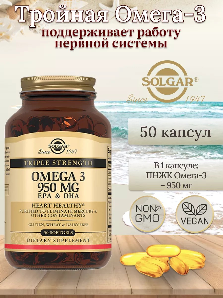 Solgar Triple Strength Omega 950 mg EPA and DHA is used as an additional source of Omega-3. Omega-3 promotes normal brain function, strengthens the immune system, protects the heart and blood vessels, supports the nervous system, and improves mood. Taking the supplement has a beneficial effect on the skin, reduces the level of "bad" cholesterol, removes toxins, and maintains vision. People who take the supplement have a reduced risk of atherosclerosis, thrombosis, and heart attack. Solgar Triple Strength Omega 950 mg EPA and DHA is used for: Decreased immunity. Neurological disorders. Prevention of thrombosis, heart attack, atherosclerosis, and diseases of the cardiovascular and visual systems. Mental impairment. Treatment of skin diseases. It is recommended to take 1 capsule daily with food. ***This is not a medicine (dietary supplement). Consult a doctor before using this dietary supplement. The photo of the dietary supplement may differ from the actual product you receive, as the manufacturer reserves the right to alter the packaging.