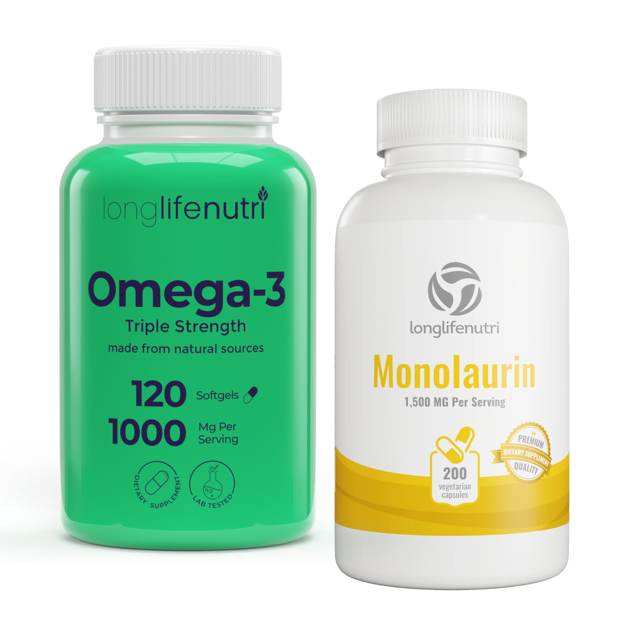 LongLifeNutri Omega-3 Fish Oil 1000 mg Monolaurin 1500 mg – Dual-Support Wellness Bundle Simplify your daily regimen with two complementary nutrients in one convenient pack. Sustainably sourced salmon oil delivers concentrated EPA and DHA omega-3s, while coconut-derived monolaurin provides a clean source of medium-chain components—ideal for rounding out everyday nutrition. What's Inside Omega-3 Fish Oil 1000 mg – 120 mini softgels (4-month supply) featuring EPA DHA fatty acids for balanced daily intake. Monolaurin 1500 mg – 200 vegetarian capsules (3-month supply) offering pure glycerol monolaurate from raw, non-GMO coconut. Key Points Non-GMO, gluten-free, without artificial colors or preservatives Easy-to-swallow formats for seamless daily use Long-lasting supplies reduce the need for frequent re-orders Crafted in the USA in GMP-certified, third-party-tested facilities Quality You Can Trust Our fish oil is molecularly distilled for purity, and every batch of monolaurin is lab-verified for consistent potency. Each supplement is produced under strict Good Manufacturing Practices to help ensure safety and reliability. Intended to support general wellness. This product is not intended to diagnose, treat, cure, or prevent any disease. Add the LongLifeNutri Omega-3 Monolaurin Bundle to your cart today and enjoy straightforward, everyday support!