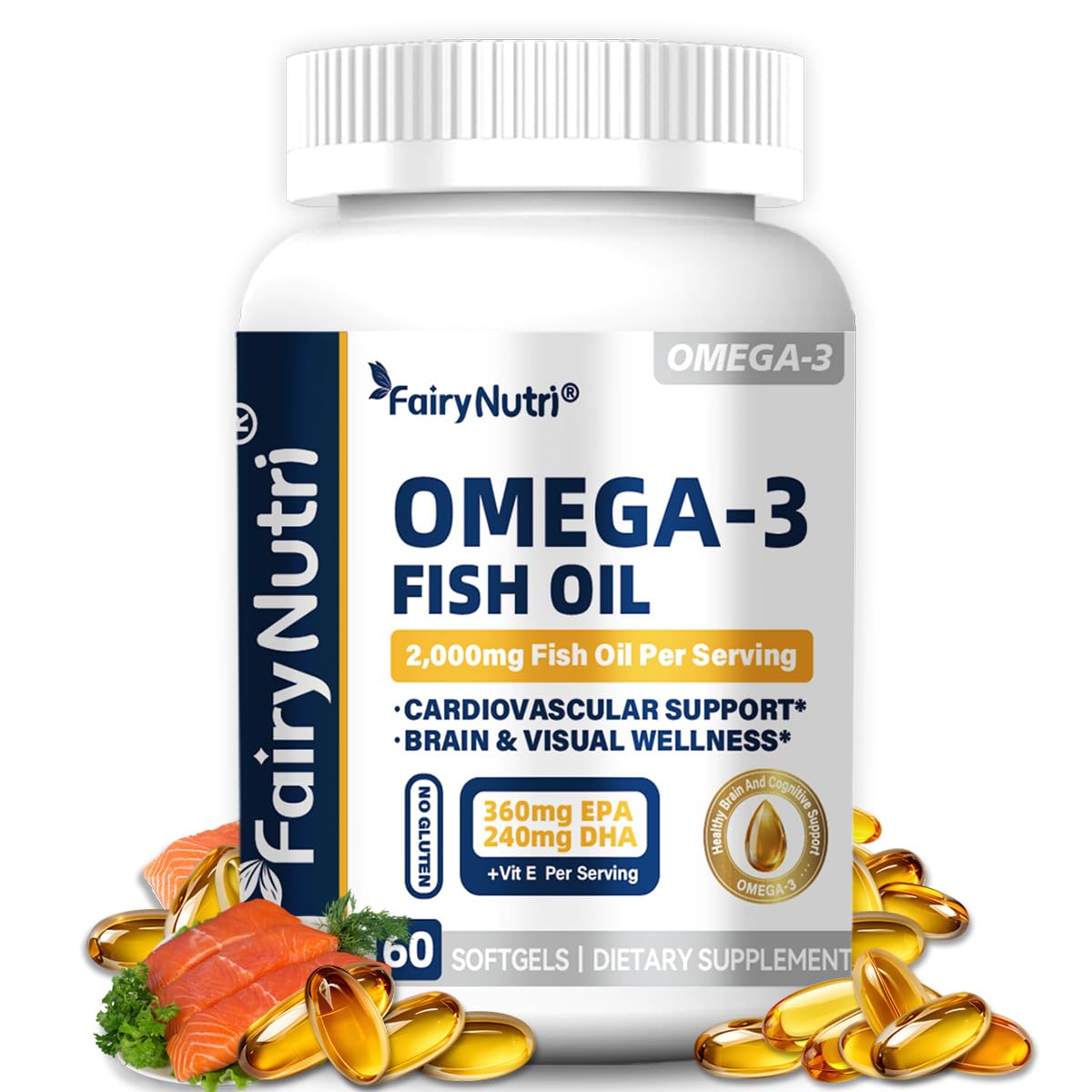 Clean Formula – No gluten, preservatives, heavy metals, artificial flavors, or sucrose suitable for daily long-term use. ✓ Certified Safe Trusted Quality – cGMP, third-party tested, NSF-certified 34 years of FairyNutri's health care expertise (est. 1991). Sustainable Deep-Sea Sourcing – Made from anchovies, sardines, tuna cold-pressed to lock natural nutrients, free from chemical pollution. ? Odorless Fishy-Taste-Free – Advanced processing eliminates unpleasant aftertaste easy to swallow for daily use. 2000mg Pure Fish Oil Per Serving – 360mg EPA 240mg DHA Vitamin E in 2 softgels, targeting cardiovascular, brain, and visual wellness.