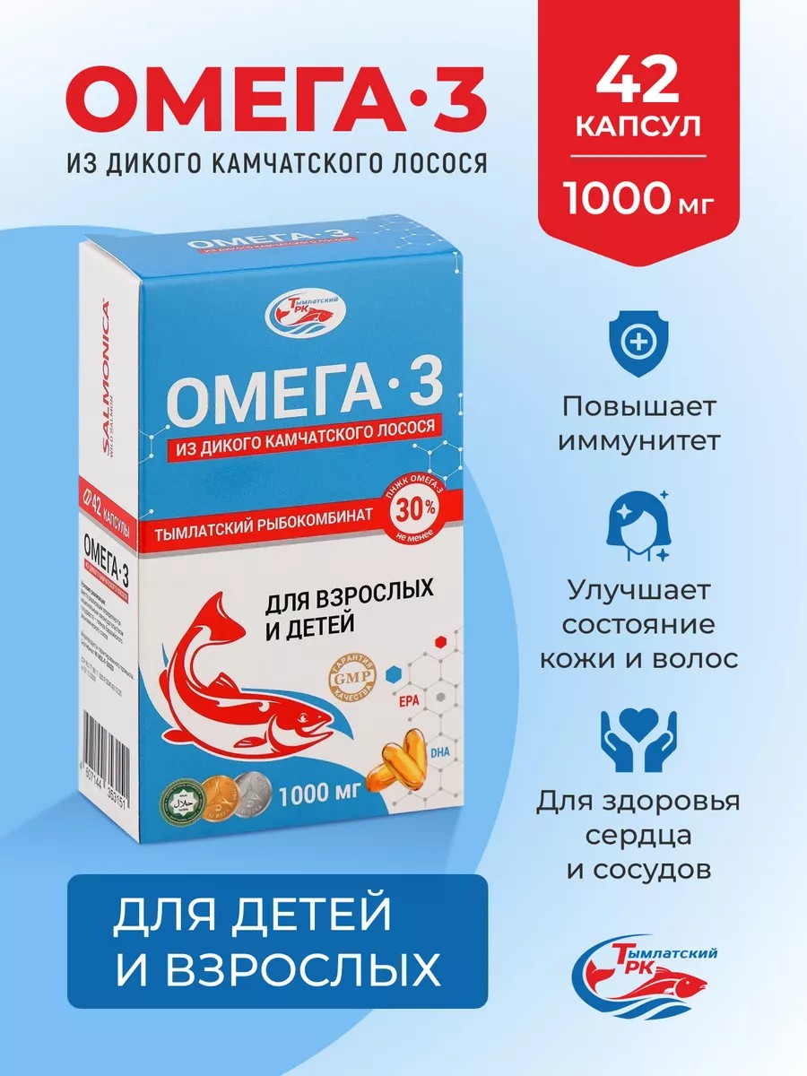 Ценное пищевое дополнение - капсулы с Омега-3. Они важны для здоровья сердца и мозга. В составе капсул – Омега 3 тымлатский рыбокомбинат рыбий жир из дикого камчаствкого лосося. Что делает их особенно полезными и натуральными. Эти капсулы подходят для женщин, мужчин, пожилых людей и детей. Омега-3 из дикого камчатского лосося сохранит ваш организм сильным и здоровым. Упаковка содержит 42 штуки, каждая порция – 1000мг. Начните заботиться о своем здоровье прямо сейчас!