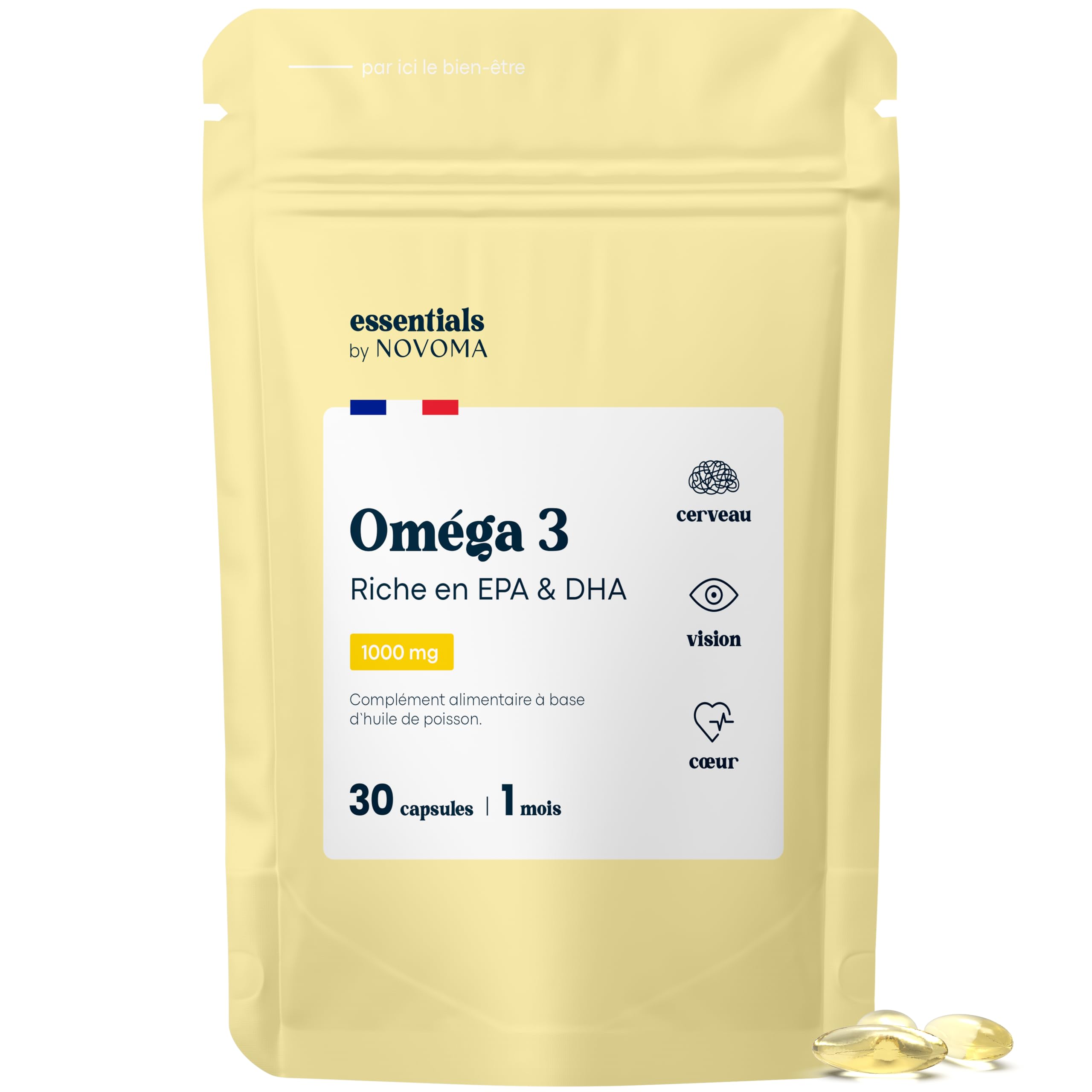 EXPERTISE FRANÇAISE. Tous les compléments alimentaires de la gamme Essentials by Novoma sont conçus et fabriqués en France. Produit garanti sans OGM et sans gluten. 1 MOIS DE CURE. Pour profiter des bienfaits des oméga 3, il vous suffit de prendre 1 capsule par jour avec un verre d'eau. Avec 30 capsules, notre complément alimentaire contient donc 1 mois de cure. BIEN-ÊTRE CARDIOVASCULAIRE. Les acides gras essentiels EPA et DHA présents dans notre huile de poisson sont indispensables pour une fonction cardiaque normale ainsi qu'au fonctionnement normal du cerveau et de la vision. FACILE À PRENDRE. Pour une utilisation facile et sans désagrément, nos capsules n'ont pas d'odeur ni de goût de poisson. Elles ont aussi une excellente résistance à l'oxydation !. HAUTE TENEUR EN OMÉGA 3. Notre complément est élaboré à partir d'huile de poissons sauvages offrant une concentration idéale en acides gras oméga-3. Chaque capsule contient 1000 mg d'huile de poisson ultra pure dont 250 mg d'EPA et 250 mg de DHA.