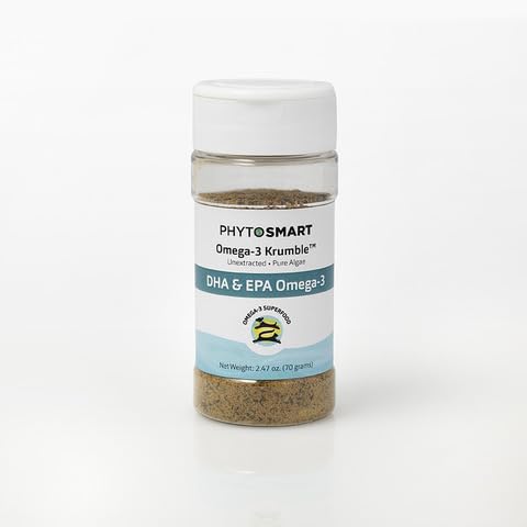 PhytoSmart Omega-3 Krumble for Pets is contaminant-free, unextracted (made from whole-cell micro-algae without the use of heat), and rich in bioavailable omega-3s. We never use heat or chemicals, preserving the integrity of our algae and protecting against oxidation. Unlike fish-derived oils, our vegan, sustainable approach bypasses overfishing and supports healthier ecosystems. -Marine microalgae are the original source of omega-3 fatty acids, producing essential nutrients and natural antioxidants that protect against harmful free radicals. With PhytoSmart Krumble, you get stable, whole-food omega-3 nutrition—without the fish, without the oil! The 70-gram shaker top jar is perfect for convenient portioning—sprinkle it directly onto food or scoop it out with a spoon to serve on its own if you have a picky pet or a pet that doesnt like stuff added to their foods. PhytoSmart Omega-3 Krumble EPA and DHA is a lightweight, shelf-stable dried flake that doesn't require refrigeration, making it easy to store in a cool dry location like your pantry. Packed with nutrient-dense, bioavailable omega-3's, KRUMBLE EPA and DHA provides a mess- free, hassle-free alternative to traditional extracted omega-3 oils, eliminating the risk of oxidation. What's the Difference Between DHA and EPA? DHA (Docosahexaenoic Acid) – Essential for brain, eye, and cognitive health, reduces inflammation, promotes skin and coat health. EPA (Eicosapentaenoic Acid) – Reduces inflammation, supports joints, and promotes heart health. PhytoSmart's Algae-based Omega-3 EPA and DHA combination naturally contains high DHA with EPA benefits.100 Plant-Based Vegan – No fish harvesting, no marine ecosystem damage. Cruelty-Free Ethical! No harm to fish or marine life. PhytoSmart's Whole-Food Omega-3s retain essential enzymes cofactors lost in fish oil processing. Perfect for pet parents who demand whole-food, species-appropriate nutrition without compromises while prioritizing natural, minimally processed nutrition with functional ingredients that support their pet's health without synthetic additives or inflammatory side effects. No Ocean Contaminants – Free from mercury, PCBs, and microplastics, heavy metals. Gentle on Digestion – No oily residues that cause diarrhea, vomiting, burping or food sensitivities. Our product is pure algae and has a natural ocean-scent. DOGS AND CATS love this smell - It is the real stuff without preservatives, additives or chemical odor blockers. PhytoSmart believes in purity, and we choose to provide our customers with the cleanest whole food Omega-3 without the use of any chemical scent blockers to hide natures natural scents. Proudly Made in Maine USA! Our Omega-3 is harvested from marine microalgae grown in Maine using a patented, sterile, and controlled process. This ensures the highest purity and freshness while being 100 free from microplastics, heavy metals, peroxides, and preservatives. It's a clean, safe, and nutritious vegan source of essential DHA, perfect for pets of all species. PhytoSmart Omega-3 Krumble provides support for pets suffering from joint and arthritic discomfort. The anti-inflammatory effects of omega 3's help support pets with skin and coat conditions and those that need the right balance of essential fatty acids for Heart Health. Our combination of Marine Micro Algae derived EPA and Phospholipid DHA is especially effective in supporting cognitive health for elderly pets and growing puppies and kittens. PhytoSmart Omega-3 Krumble is the only truly sustainable, natural, non-GMO, vegan-friendly, nutrient dense, High-Impact health supplement. Our natural whole-food algal omega-3 PLDHA and EPA is a Complete Omega-3 that is the safe and effective choice for pets of all ages and sizes. Whether your pet needs a daily wellness boost or you're seeking preventive care, PhytoSmart Omega-3 products offer pure whole food transformative solutions that promote vitality and longevity.