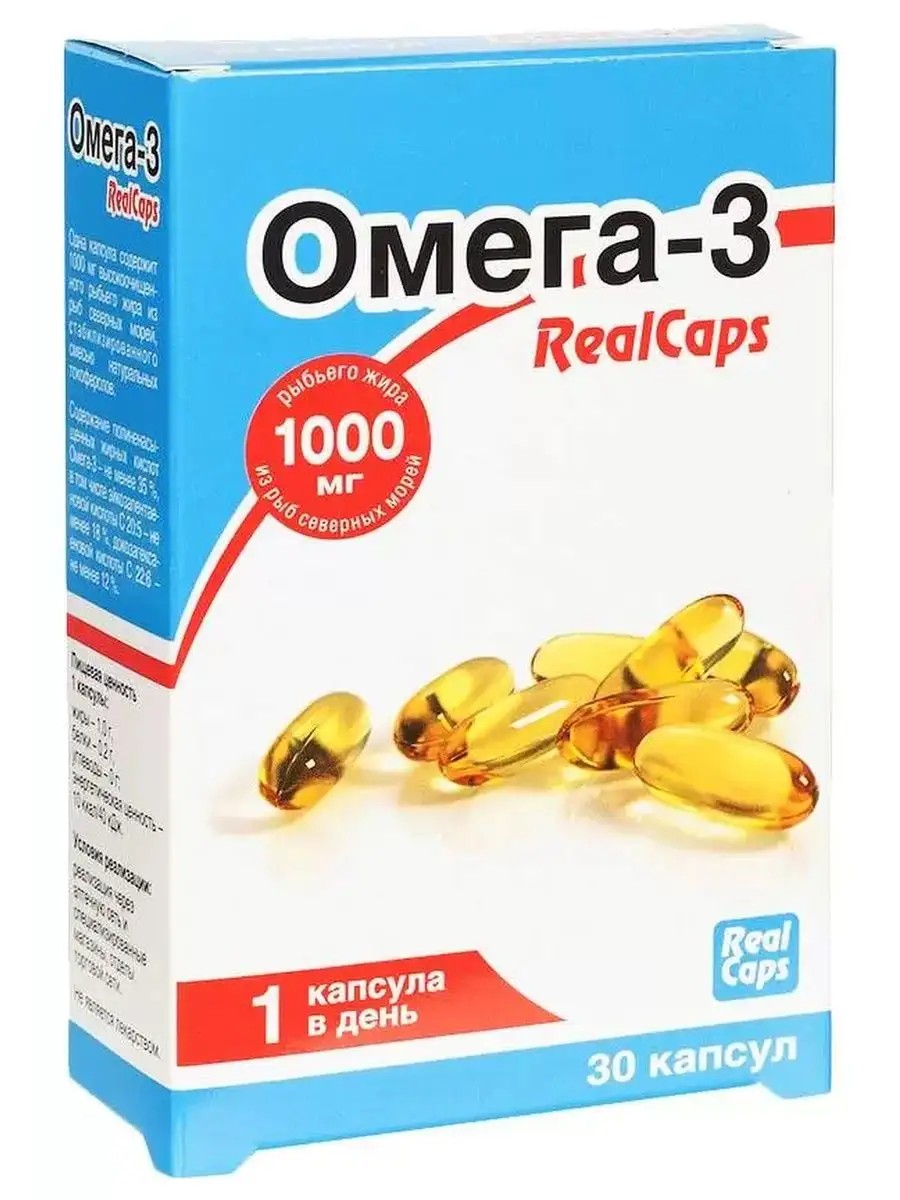 Омега 3 RealCaps натуральный источник омега 3 жирных кислот, который поможет естественным образом восполнить их недостаток в питании. Для производства Омега 3 RealCaps используется рыбий жир из Исландии, полученный из рыб с коротким жизненным циклом (Анчоусовые, Ставридовые, Корюшковые, Песчаниковые), выловленных в Северном и Норвежском морях. Жир произведен с применением современных высокотехнологичных методов очистки и разрешен к применению беременным и кормящим женщинам.