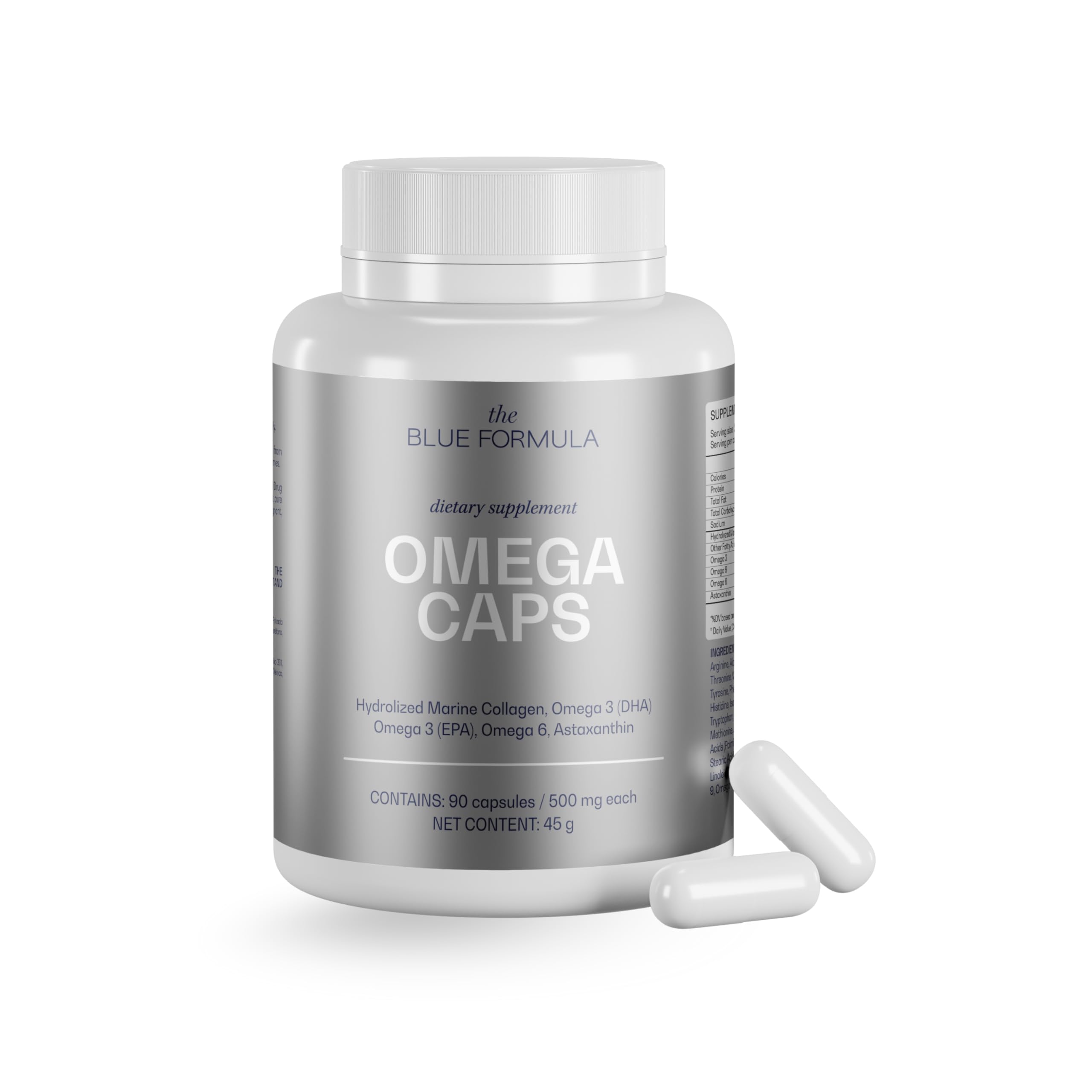 Experience the power of ocean-born wellness with The Blue Formula Omega Hydrolized Marine Collagen Capsules, a premium blend crafted for those who value health, vitality, and timeless beauty. Our unique formula combines Omega 3, 6 9 fatty acids with hydrolyzed marine collagen, designed to support joint flexibility, brain function, heart health, and skin elasticity from within. Enriched with natural Astaxanthin, one of nature's most potent antioxidants, this advanced complex helps combat oxidative stress, promoting cellular protection and youthful energy every day. Each bottle provides 90 capsules (30 servings) , perfectly balanced for daily use to enhance your inner strength, outer glow, and overall well-being. Pure. Powerful. Premium. Because your body deserves nothing less than The Blue Formula, where nature and science meet to help you look and feel your best.✓ DAILY WELLNESS MADE EASY – Includes 90 capsules (30 daily servings), conveniently taken with water, perfect for adding powerful omega supplements and collagen support to your daily wellness routine. ✓ ANTIOXIDANT POWER WITH ASTAXANTHIN – Enhanced with Astaxanthin, one of the most powerful antioxidants found in nature, to help protect your cells from oxidative stress, support skin elasticity, and promote recovery from daily activity. The perfect complement for youthful energy and radiant health. ✓ PURE, NATURAL, AND SCIENCE-BACKED – Crafted with high-purity marine ingredients, our Omega 3 6 9 supplement offers clean, potent nutrition without artificial colors, flavors, or preservatives. Third-party tested to ensure safety, potency, and quality in every capsule. ✓ PREMIUM QUALITY FOR SUPERIOR RESULTS – Each serving provides powerful Omega 3 6 9 support combined with hydrolized marine collagen to nourish your body inside out. Helps maintain smooth skin, strong hair, and flexible joints while supporting cardiovascular and cognitive health. ✓ UNIQUE OMEGA HYDROLIZED MARINE COLLAGEN FORMULA – Experience the exclusive blend of Omega 3, 6 9 fatty acids with hydrolyzed marine collagen, designed to support joint flexibility, enhance brain function and focus, promote heart health, and encourage youthful, radiant skin from within. A premium formula for complete inner wellness and vitality.