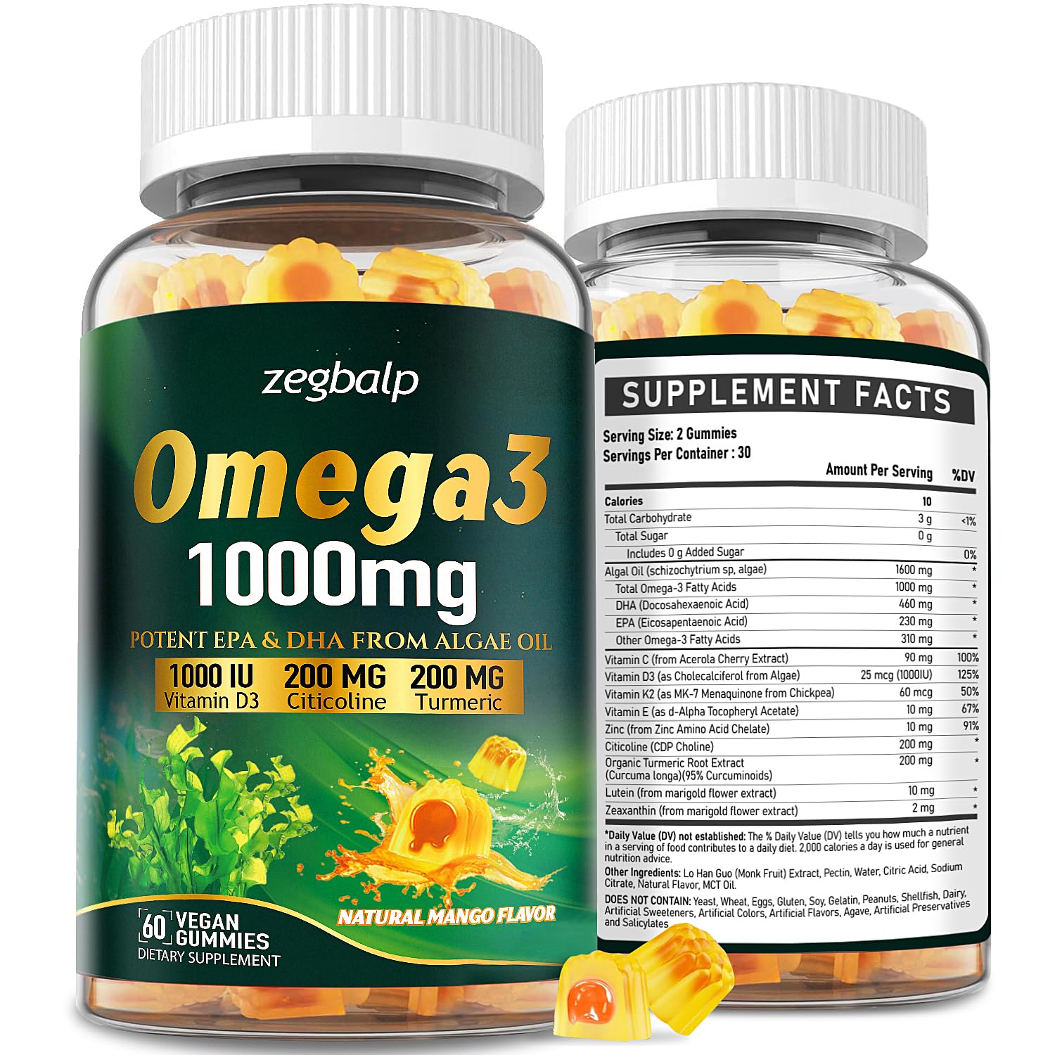 FORMULATED WITH VEGAN AND NATURAL INGREDIENTS: Our Omega 3 supplement for women and men is designed for those seeking vegan and contamination-free options. Rigorously tested for purity and potency, it ensures exceptional quality. Made with natural ingredients, it is gelatin-free, Non-GMO, and devoid of artificial flavors, colors, sweeteners, starch, soy, yeast, wheat, eggs, and preservatives. FULL-BODY HEALTH BENEFITS: The EPA in Our Omega 3, when combined with Turmeric and Vitamin D3 K2, supports balanced bodily responses, aids post-activity rec0very, and promotes flexible movement. Additional ingredients like Vitamin C, D3, and Zinc bolster the immune system, while Vitamins C and E offer antioxidant support, reducing oxidation of Omega-3. Our vegan Omega 3 gummy is specifically formulated to promote overall age-related health for active adults and seniors. POWERFUL EPA DHA OMEGA 3 SUPPLEMENT: The two essential omega-3 fatty acids, DHA and EPA, are provided in a balanced, bioavailable form easily utilized by the body. Our Omega 3 supplement is formulated with lutein and zeaxanthin to support bright vision. When combined with citicoline, it enhances attention and c0gnitive sharpness. If you're office staff, gamers, or students who are exposed to screens for long periods daily and have hectic schedules, it can help unleash your full potential. HIGH-EFFICIENCY FILLED GUMMIES: Enjoy our sugar-free Omega 3 gummies, which come in a natural and delicious mango flavor without any fishy taste. These gummies are made with an outer layer of pectin and filled with liquid, protecting the fresh algae oil from temperature fluctuations and air exposure. This ensures high bioavailability and stability, ultimately facilitating the body's efficient absorption of Omega3. OMEGA 3 VEGAN SOURCED: Our Omega 3 1000mg gummies are crafted from natural marine algae oil, the original plant-based source of essential Omega-3 fatty acids (DHA and EPA). This sustainable formula delivers a fish-free dose with no aftertaste or burps, providing your body with vital fatty acids, along with other high absorption ingredients, for optimal health. Take 2 gummies daily to help support your wellness foundation.