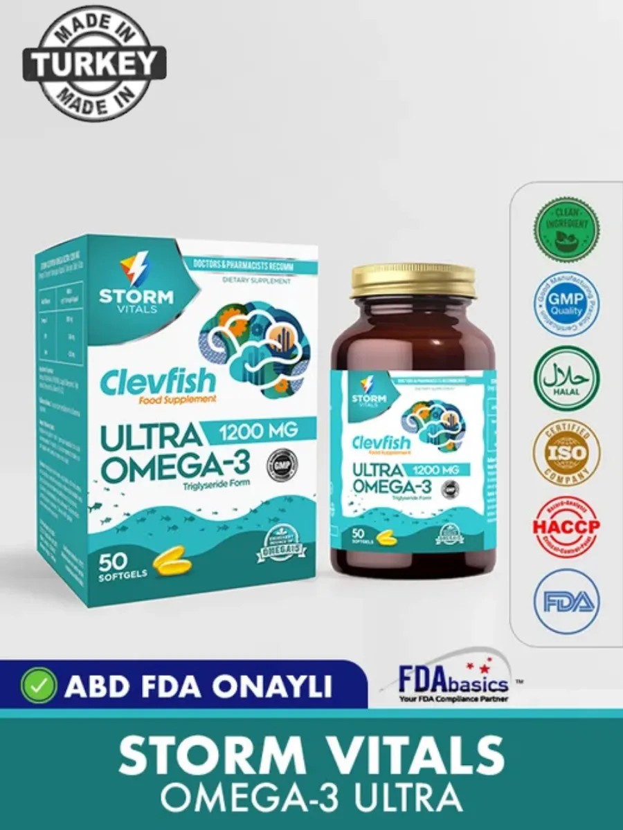 STORM CLEVFISH Omega Ultra 1200 mg is a dietary supplement in softgel form containing high-quality omega-3 fatty acids EPA and DHA.