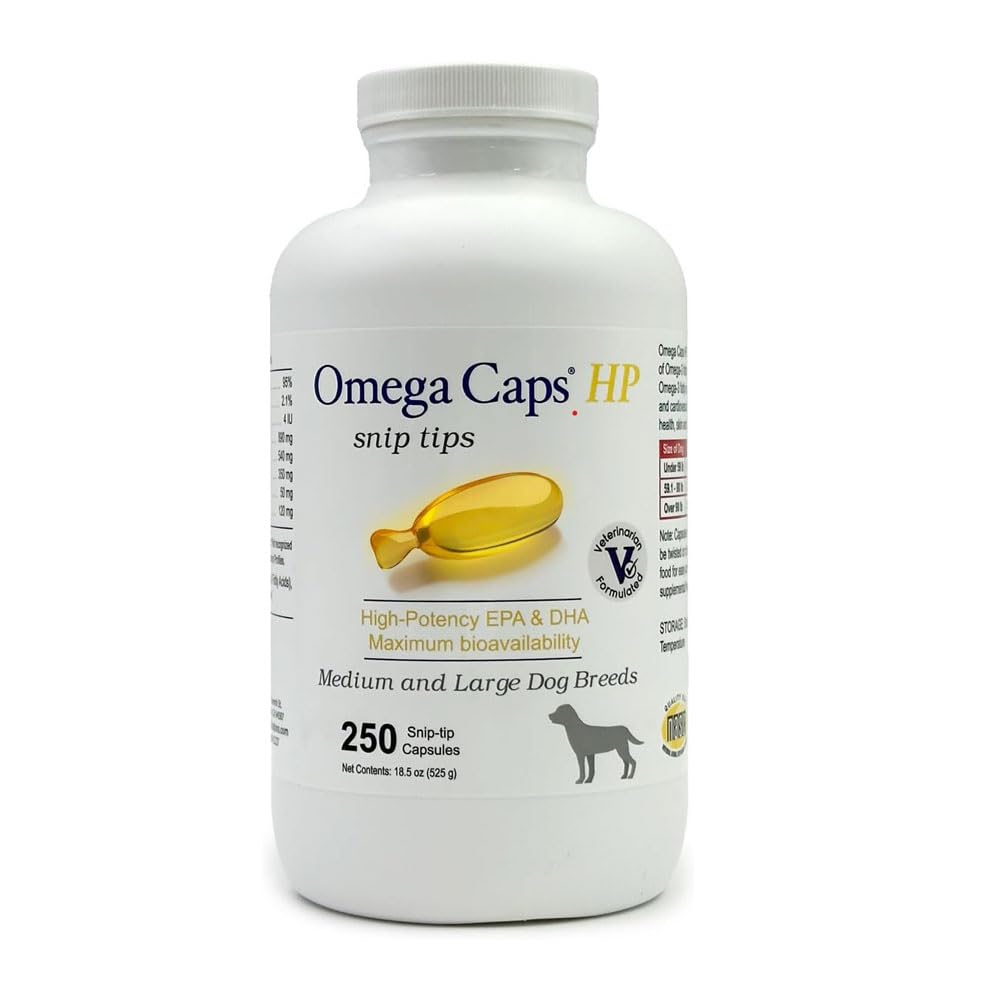 Omega Caps HP Snip Tips for Medium and Large Dogs High Potency EPA and DHA Maximum Bioavailability Fish Oil Supplement Vet Formulated Made in USA Skin Coat Joint and Heart Health 250 Capsules Medium & Large Dogs Snip Tips (