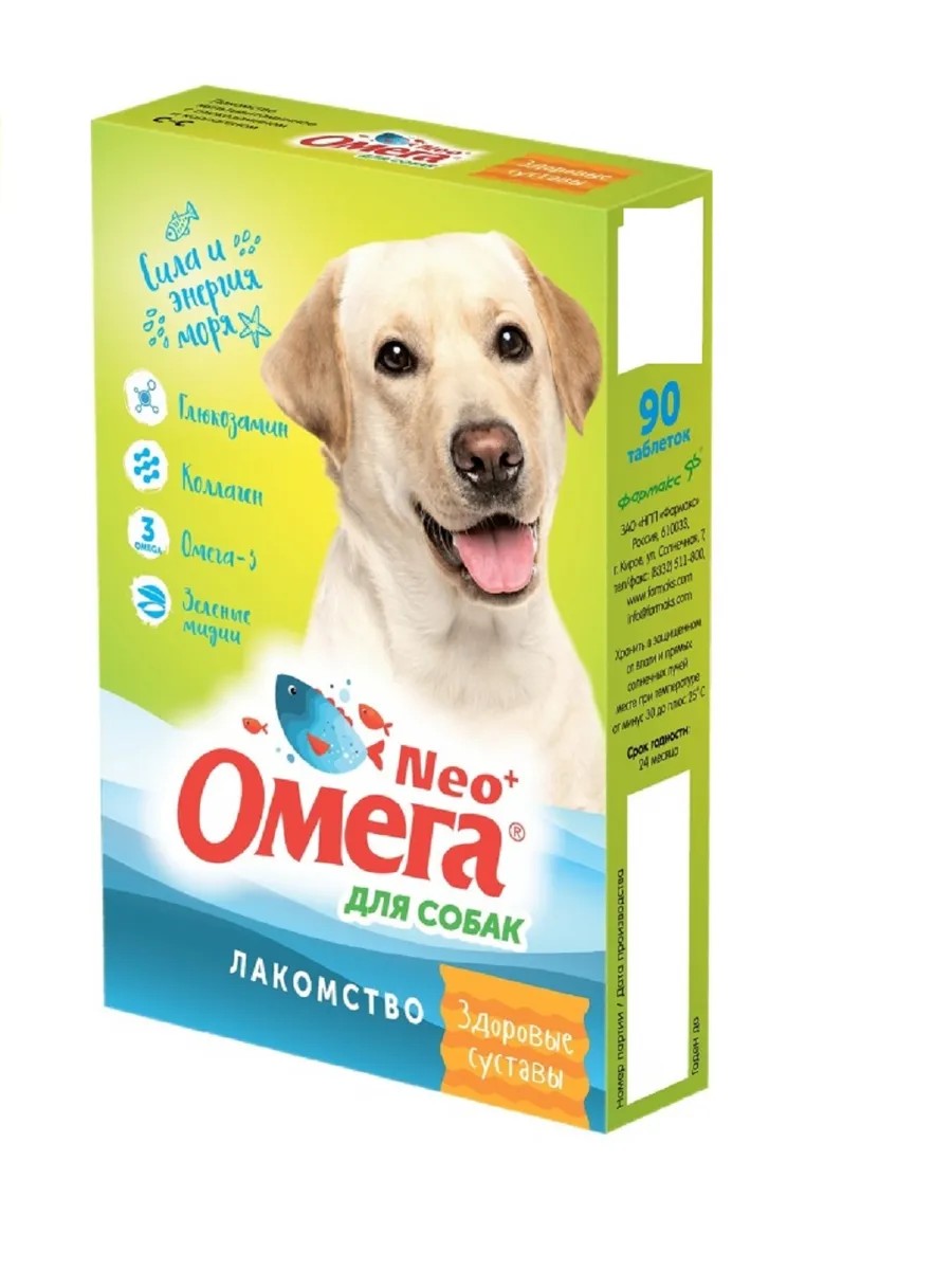 Омега Neo+ Лакомство для собак Здоровые суставы, в уп 90 таб. Омега Neo+ единственное отечественное лакомство, содержащее в составе новозеландские зеленые мидии, морские водоросли и Омега-3 кислоты. Глюкозамин и новозеландские зеленые мидии способствует укреплению хрящевой ткани суставов. Коллаген обеспечивает подвижность суставов. Омега-3 кислоты поддерживают иммунитет и улучшают состояние кожи и шерсти.Пивные дрожжи – натуральный источник витаминов группы В. Применение и дозировка:Рекомендуется применять ежедневно в течение всего года собакам мелких пород 3-6 таблеток, собакам средних пород 6-9 таблеток, собакам крупных пород 9-15 таблеток. Состав: Обезжиренное сухое молоко, Пивные дрожжи, Рыбий жир, Лактоза, Желатин, Глюозамина гидрохлорид, Мидии зеленые.