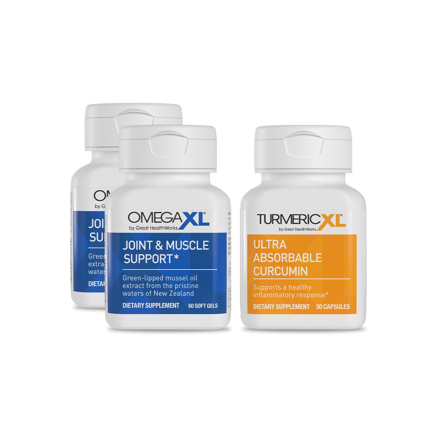 COMMITTED TO WELLNESS - Founded in 2003 Great HealthWorks is dedicated to delivering quality health and wellness products to our consumers. Our mission is to make meaningful differences in people's lives by offering natural, science-based solutions. EXTRA STREGTH IN A TINY DOSE - TurmericXL's state-of-the-art technology delivers an extraordinary 45 times more bioactive curcumin compared to standard 95 pure curcumin capsules. This means you get more curcumin goodness in just one small capsule than you would in 10 standard 1,000 mg capsules that contain 95 pure curcumin. Our advanced formulation ensures maximum absorption and utilization by your body, unlocking the true potential of turmeric. THE WONDER SPICE – TurmericXL's primary active ingredient, high-quality curcumin, has been shown to have potent antioxidant properties, which helps combat cellular stress. MUSSELS FOR YOUR JOINTS - OmegaXL is a drug-free, natural dietary supplement that when taken daily, has been shown to promote joint health and improve mobility. Don't let occasional aches and pains hold you back from living a healthy active life. XL BENEFITS – OmegaXL is the ultimate joint health and mobility support supplement. It is a concentrated source of green-lipped mussel oil packed with a powerful combination of healthy fatty acids and lipid mediators. This super-oil contains over 30 fatty acids and Specialized Pro-Resolving Mediators (SPMs) that promote joint and muscle health. Backed by over 35 years of clinical research, this high-potency blend promotes joint, muscle, and respiratory health. ONE, TWO PUNCH – These two powerful products complement each other as they both work to promote a healthy inflammatory response, but in different ways. OmegaXL targets the resolution phase of inflammation where tissue rejuvenation occurs, whereas TurmericXL targets the initiation phase of inflammation. OmegaXL can take time to build in your system, while TurmericXL is rapidly absorbed and distributed throughout the body because of its advanced delivery system. That's why we created this combination, so TurmericXL can start to get to work while OmegaXL reaches its full potential.