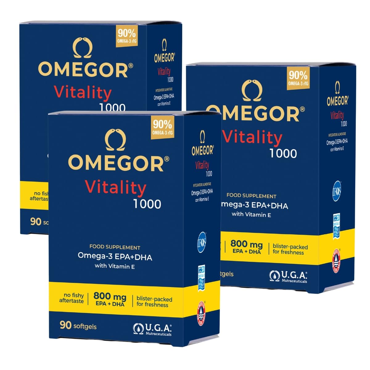 Protective blister packaging - Each Omegor Vitality 1000 capsule is individually blister-packed to preserve the integrity and effectiveness of the highly concentrated omega-3. This packaging system protects the capsules from oxidation and moisture, thus preserving their freshness. In addition, the product is enriched with vitamin E, which acts as a natural antioxidant and provides optimal protection and increased stability of the supplement. Pharmaceutical grade - Omegor Vitality 1000 is manufactured in facilities that operate strictly according to current Good Manufacturing Practices (cGMP), ensuring that each supplement is of pharmaceutical grade. This rigorous and precise manufacturing process makes Omegor Vitality 1000 a reliable product, perfect for anyone seeking maximum safety and quality in their Omega-3 supplement. Purest Fish Oil - The advanced multi-molecular distillation technology used in Omegor Vitality 1000 ensures that the fish oil is free from impurities such as mercury, dioxins, and PCBs. This purification process guarantees a safe and pure product, ideal for health-conscious individuals seeking a supplement free of impurities. IFOS 5-Star Certification Since 2006 - Omegor Vitality 1000 has held the prestigious IFOS 5-Star certification since 2006, a mark of product purity, concentration, and freshness. This standard of excellence ensures that each capsule delivers maximum benefits, making Omegor Vitality the trusted choice for those who want to get the most out of omega-3 supplements. Super concentrated with over 90 omega-3 in rTG form for optimal absorption – Omegor Vitality 1000 is formulated with a concentration of over 90 omega-3 in triglyceride form, ensuring optimal absorption and natural support for daily well-being. This high concentration of high-quality fish oil makes Omegor the ideal choice for those seeking a premium supplement to promote heart, brain, and joint health.Emballage blister protectrice - Chaque capsule d'Omegor Vitality 1000 est emballée individuellement dans un blister pour préserver l'intégrité et l'efficacité de l'oméga-3 hautement concentré. Ce système d'emballage protège les capsules de l'oxydation et de l'humidité, préservant ainsi leur fraîcheur. En outre, le produit est enrichi en vitamine E, qui agit comme un antioxydant naturel et offre une protection optimale et une stabilité accrue du supplément. Qualité pharmaceutique - Omegor Vitality 1000 est fabriqué dans des installations qui fonctionnent strictement selon les bonnes pratiques de fabrication actuelles (cGMP) et garantissent que chaque supplément est de qualité pharmaceutique. Cette rigueur et précision dans la fabrication font d'Omegor Vitality 1000 un produit fiable, parfait pour tous ceux qui recherchent une sécurité et une qualité maximales en matière de complément Omega-3. Huile de poisson la plus pure - La technologie avancée de distillation moléculaire multiple utilisée dans Omegor Vitality 1000 garantit que l'huile de poisson est exempte d'impuretés telles que le mercure, les dioxines et les PCB. Ce processus de nettoyage garantit un produit sûr et pur, idéal pour ceux qui prennent soin de leur santé et qui recherchent un complément sans impuretés. Certification IFOS 5 étoiles depuis 2006 - Omegor Vitality 1000 a obtenu la célèbre certification IFOS 5 étoiles depuis 2006, un signe de pureté, de concentration et de fraîcheur du produit. Cette norme d'excellence garantit que chaque capsule offre un maximum d'avantages, faisant d'Omegor Vitality le choix fiable pour ceux qui veulent tirer le meilleur parti des suppléments d'oméga-3. Super concentré avec plus de 90 d'oméga-3 sous forme rTG pour une absorption optimale - Omegor Vitality 1000 est formulé avec une concentration de plus de 90 d'oméga-3 sous forme de triglycérides, ce qui garantit une absorption optimale et un soutien naturel du bien-être quotidien. Cette forte concentration d'huile de poisson de haute qualité fait d'Omegor le choix idéal pour ceux qui recherchent un complément de première classe pour promouvoir la santé du cœur, du cerveau et des articulations.Omegor Vitality 1000 - avec 800 mg d'EPA DHA par capsule Certification 5 étoiles IFOS depuis 2006 90 d'Omega 3 sous forme rTG Dose élevée d'EPA et DHA - 90 x 3 capsules 90 unité (Lot de 3)
