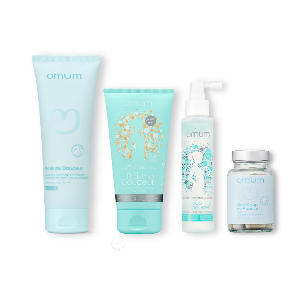 OMUM, a French brand specializing in women's beauty and well-being, offers organic skincare and natural supplements to support women through every hormonal stage: menstruation, PMS, trying to conceive, pregnancy, postpartum, perimenopause, and menopause. DIRECTIONS: Take the time to massage your scalp while shampooing, and apply conditioner to the lengths of your hair to avoid clogging the hair follicles. Take 2 capsules of the supplement daily with a glass of water. For optimal effectiveness, we recommend a 3-month course. Spray the lotion onto your scalp, parting your hair section by section, then massage in circular motions with your fingertips. Do not rinse. Apply daily to dry hair. TRANSPARENCY: These products are free of essential oils, endocrine disruptors or substances suspected of being endocrine disruptors, phthalates, phenoxyethanol, parabens, SLS (sulfates), and ingredients known to be carcinogenic, mutagenic, or toxic. My Soft Bubble My Soft Balm are completely compatible with pregnancy and breastfeeding for mothers and expectant mothers. Suitable for children from 3 years old. The lotion and the anti-hair loss food supplement are only compatible with breastfeeding. ACTIVE INGREDIENTS: aloe vera, vegetable glycerin (to moisturize), red algae extracts (to coat and strengthen), gentle sulfate-free surfactants for My Soft Bubble. Aloe vera, shea butter, and red algae for My Soft Balm. The lotion is formulated with a nutrient-rich turmeric extract to stimulate growth. My Boost of Growth contains a concentrate of active ingredients that help strengthen the hair fiber (nettle, bamboo, biotin, brewer's yeast) and promote growth. TAKE CARE of your hair by adopting the hair care set! This set includes a complete hair strengthening and anti-hair loss routine with fortifying shampoo, conditioner for dry hair, anti-hair loss lotion, and hair treatment. All made in France!OMUM, marque française experte de la beauté et du bien-être féminin, propose des soins bio et compléments naturels pour accompagner les femmes à chaque étape hormonale : règles, SPM, désir d'enfant, grossesse, post-partum, préménopause et ménopause. CONSEILS : Prenez le temps de masser votre cuir chevelu pendant le shampoing, et appliquez votre après shampoing sur les longueurs afin de ne pas obstruer le follicule pileux. Prenez 2 gélules du complément par jour avec un verre d'eau. Pour une efficacité optimale, nous vous conseillons de faire une cure de 3 mois. Pulvériser le cuir chevelu raie par raie avec la lotion, puis masser du bout des doigts par mouvements circulaires. Ne pas rincer. Appliquer quotidiennement sur cheveux secs. TRANSPARENCE : Ces produits sont sans huile essentielle, perturbateur endocrinien ou substance suspectée de l'être, phtalate, phenoxyéthanol, paraben, sls (sulfates), ingrédient reconnu cancérigène, mutagène ou toxique. Ma Bulle Douceur Mon Baume Douceur sont complètement compatibles avec la grossesse et l'allaitement des mamans et futures mamans. Utilisables chez l'enfant à partir de 3 ans. La lotion et le complément alimentaire anti-chute sont, eux, seulement compatibles avec l'allaitement. LES ACTIFS : aloe vera, glycérine végétale (pour hydrater), extraits d'algues rouges (pour gainer et renforcer), tensioactifs doux sans sulfate pour Ma Bulle Douceur. Aloe vera, beurre de karité et algues rouges pour Mon Baume Douceur. La lotion est formulée autour d'un extrait de curcuma riche en nutriments, pour stimuler la croissance. Mon Coup de Pousse contient un concentré d'actifs aidant à renforcer la fibre capillaire (ortie, bambou, biotine, levure de bière) et à favoriser la croissance. PRENEZ SOIN de votre chevelure en adoptant le coffret soins cheveux ! Dans ce coffret, retrouvez une routine cheveux renfort et anti-chute complète avec le shampoing fortifiant, l'après shampoing cheveux secs, la lotion anti chute cheveux, et la cure cheveux. Le tout fabriqué en France !.OMUM - Mon Rituel Capillaire Naturel - Coffret soins cheveux renfort anti-chute - Soins Complément alimentaire - Fortifie et accelère la pousse - Vegan Naturel
